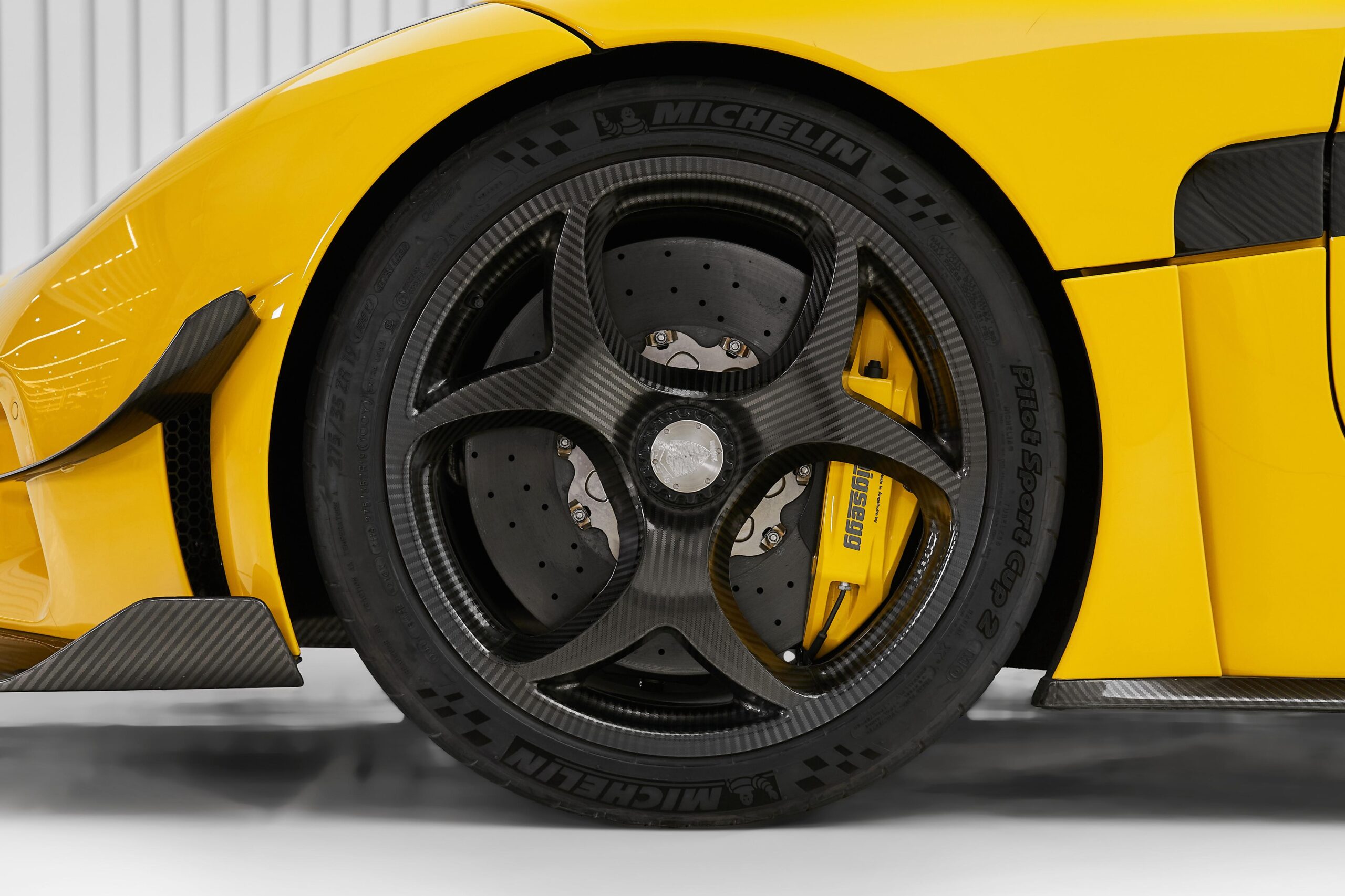 Inside, the cabin is upholstered in black leather with yellow contrast stitching, consistent with the exterior configuration. Exposed carbon fibre extends across the centre console, dashboard and steering wheel. A digital instrument cluster, central touchscreen interface, metallic switchgear and integrated Regera badging ensure modern usability without compromising the mechanical focus characteristic of Koenigsegg design. The interior layout prioritises driver clarity and comfort while maintaining the minimalist elegance expected at this segment.