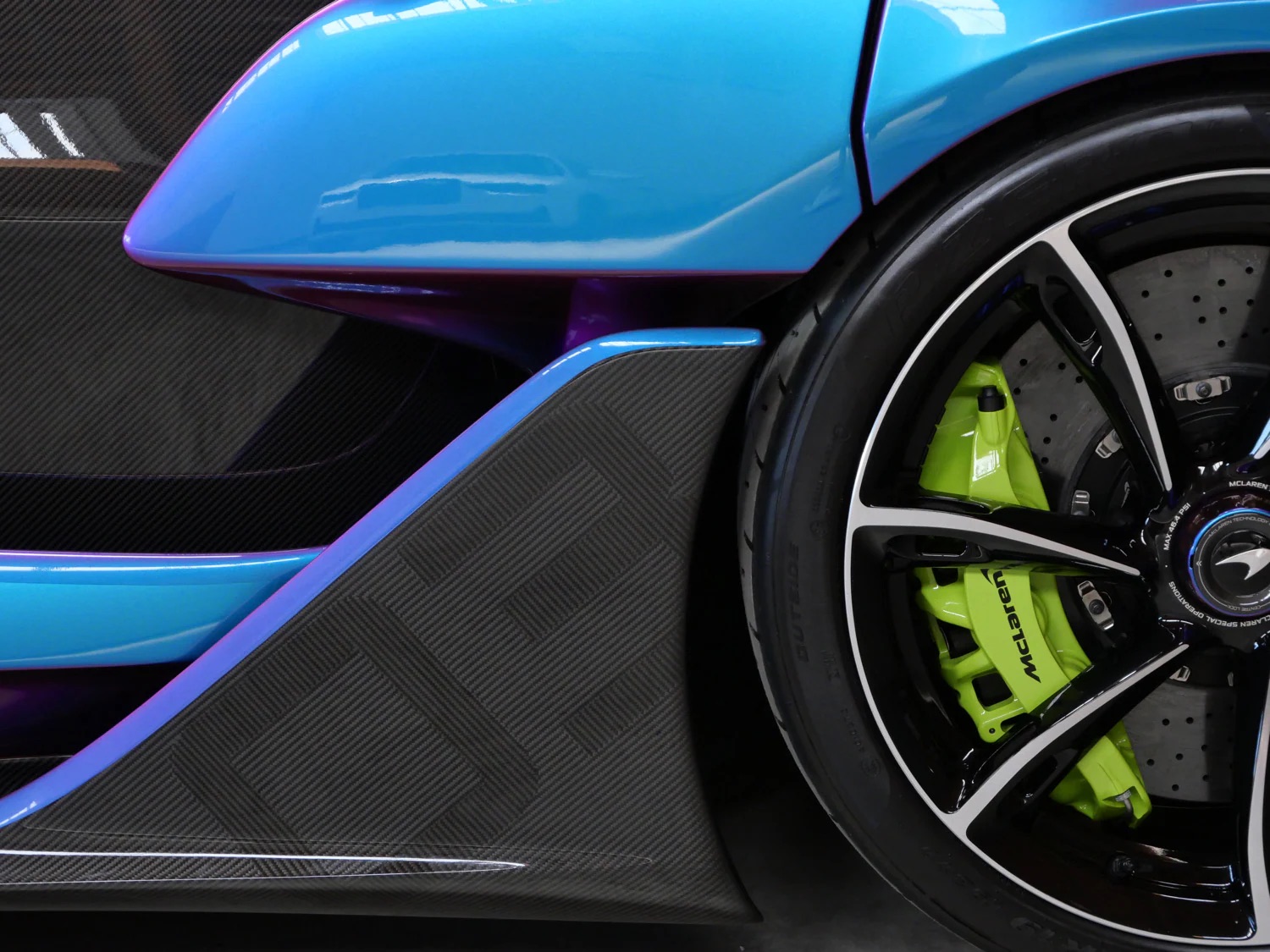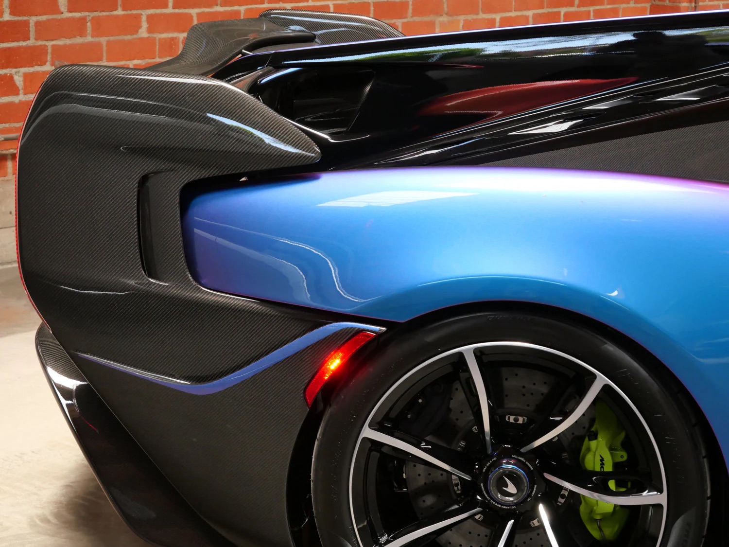 The exterior of this McLaren Sabre for sale is built around a carbon-fiber monocoque architecture, a structural signature of McLaren’s most advanced MSO programs. This example is finished in Pacific Colour Stream, an iridescent MSO paint shifting between blue, purple and teal hues depending on ambient light conditions, a finish reserved for a limited number of Sabre clients.