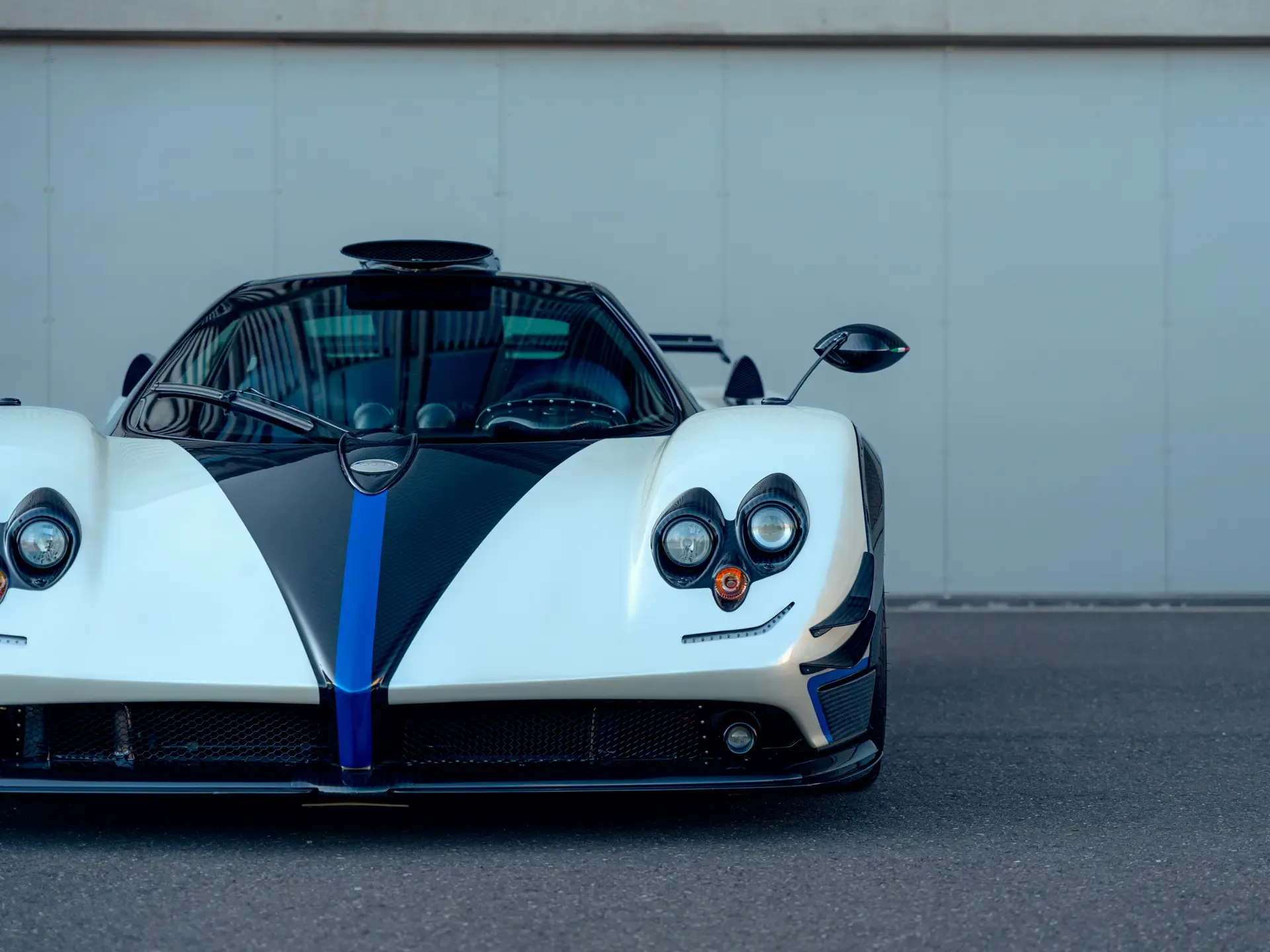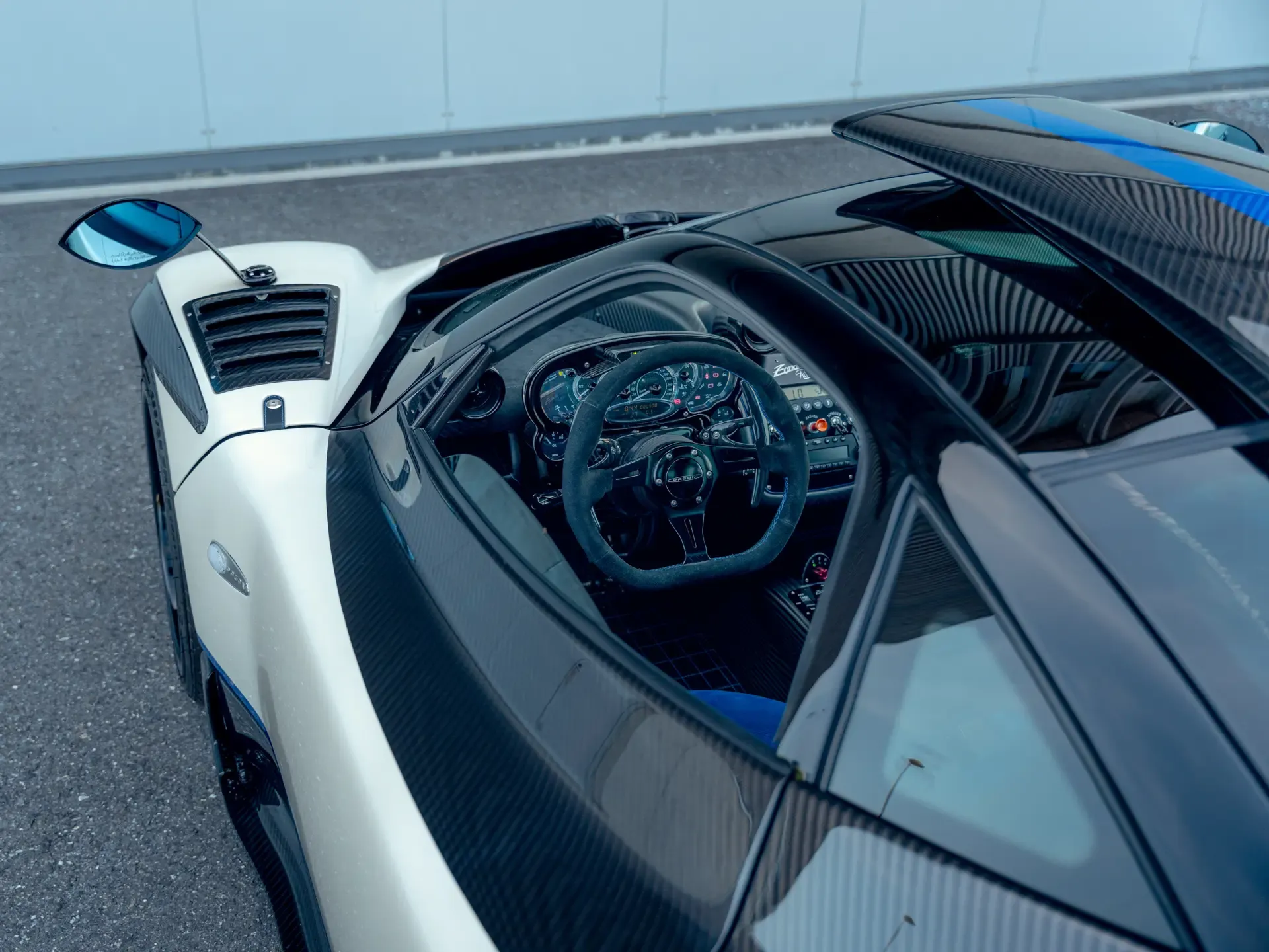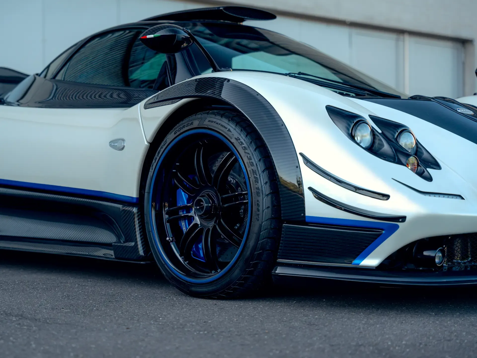 The exterior of the Pagani Zonda 760 Riviera expresses the full visual identity of the 760-series, combining sculptural carbon fibre with a configuration developed exclusively for this one-off commission. The bodywork blends exposed carbon, a pearl-white finish and blue accents that have become inseparable from the Riviera’s aesthetic signature. Its aerodynamic architecture includes the 760-spec roof scoop, factory-fitted front dive planes, a pronounced fixed rear wing and a carbon rear diffuser, all of which contribute to its unmistakable profile. Every element serves a dual purpose: functional downforce and the kind of visual purity collectors expect when evaluating a pagani zonda riviera for sale at the highest tier of the market. The forged alloy wheels and the central quad-exit exhaust complete a silhouette that remains instantly recognisable across the entire zonda 760 lineage.