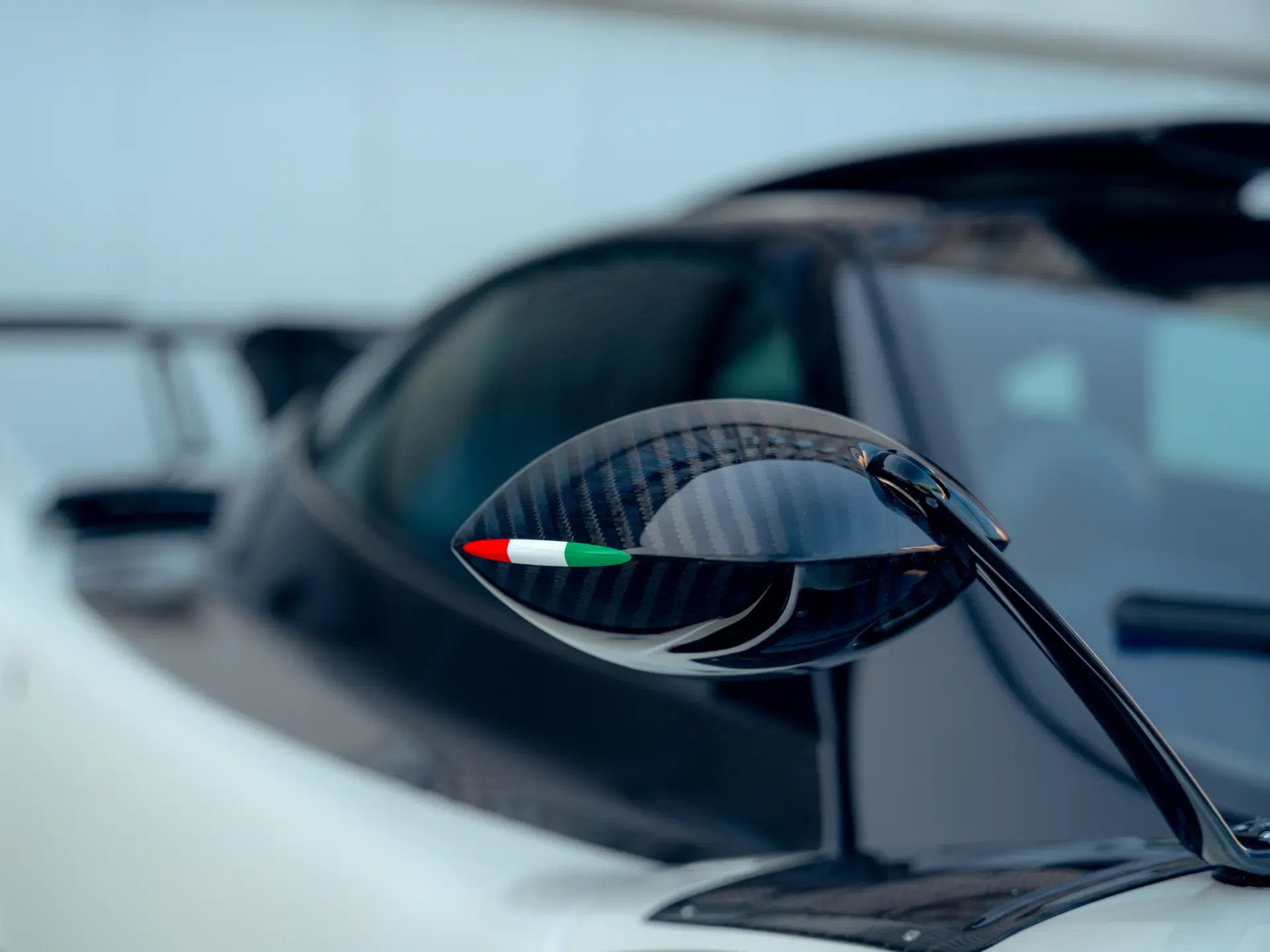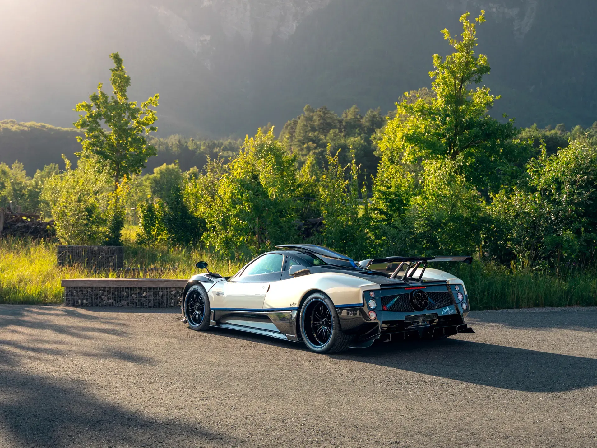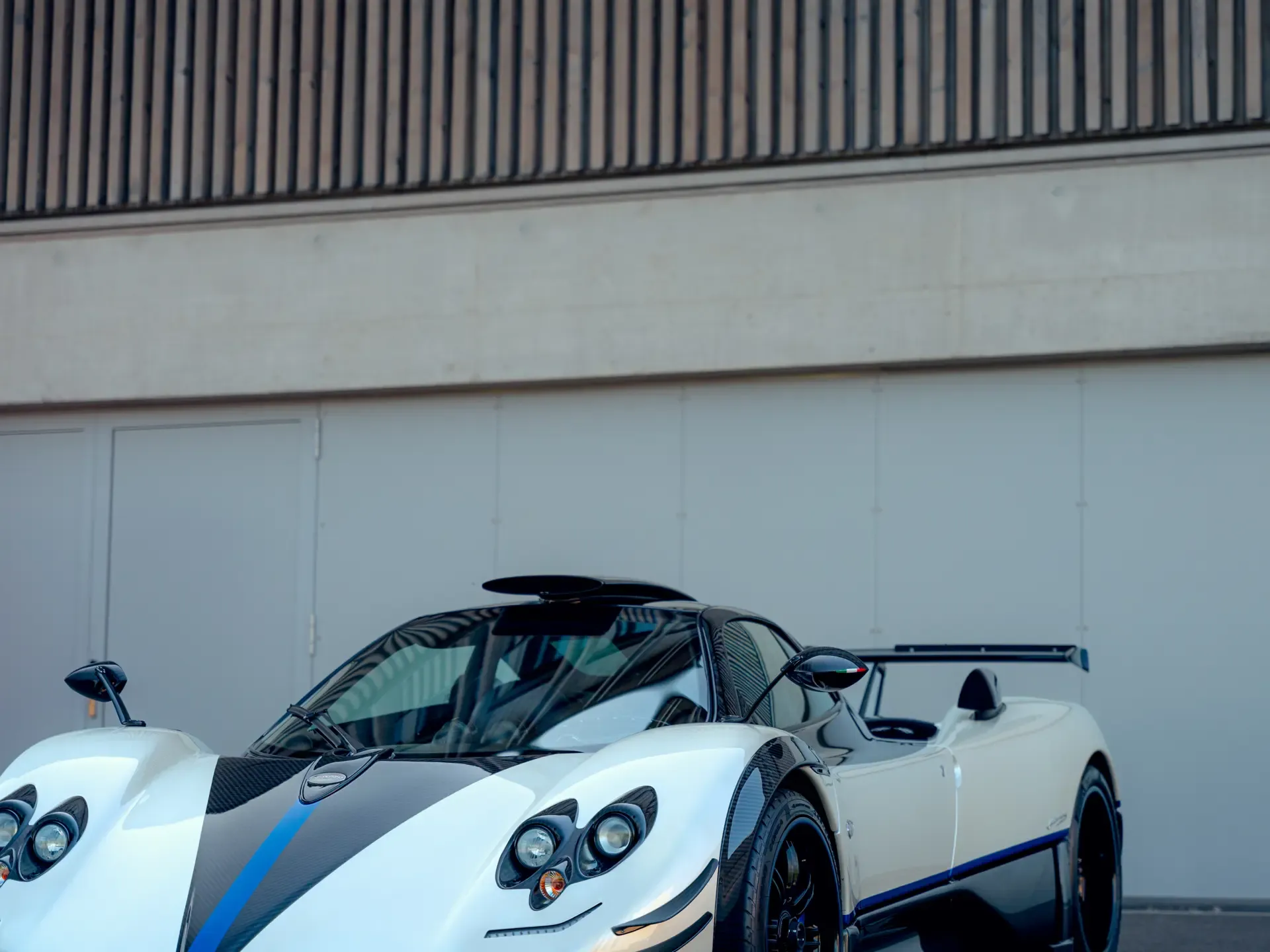 The exterior of the Pagani Zonda 760 Riviera expresses the full visual identity of the 760-series, combining sculptural carbon fibre with a configuration developed exclusively for this one-off commission. The bodywork blends exposed carbon, a pearl-white finish and blue accents that have become inseparable from the Riviera’s aesthetic signature. Its aerodynamic architecture includes the 760-spec roof scoop, factory-fitted front dive planes, a pronounced fixed rear wing and a carbon rear diffuser, all of which contribute to its unmistakable profile. Every element serves a dual purpose: functional downforce and the kind of visual purity collectors expect when evaluating a pagani zonda riviera for sale at the highest tier of the market. The forged alloy wheels and the central quad-exit exhaust complete a silhouette that remains instantly recognisable across the entire zonda 760 lineage.