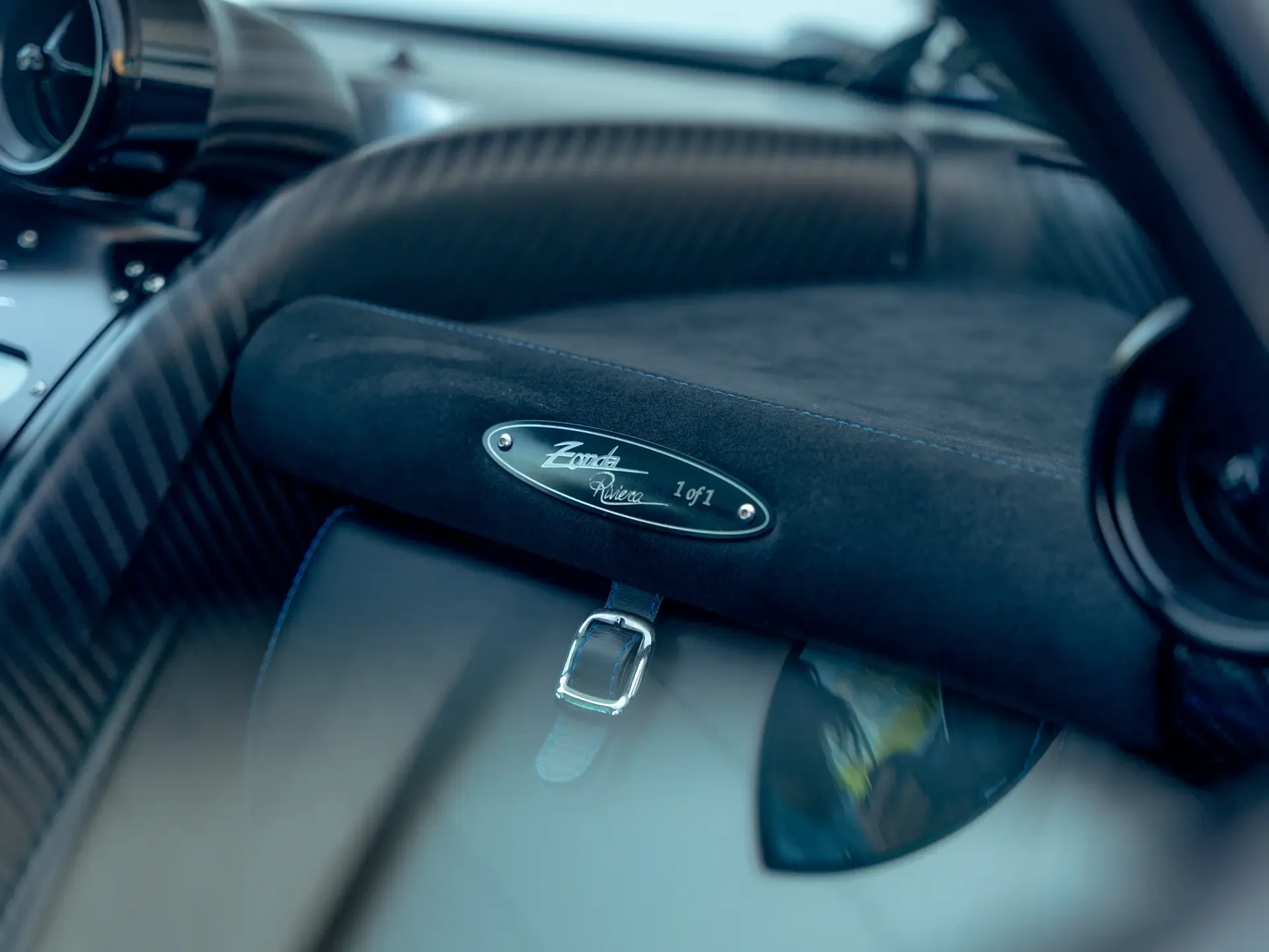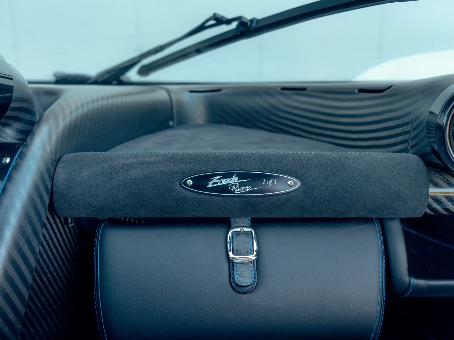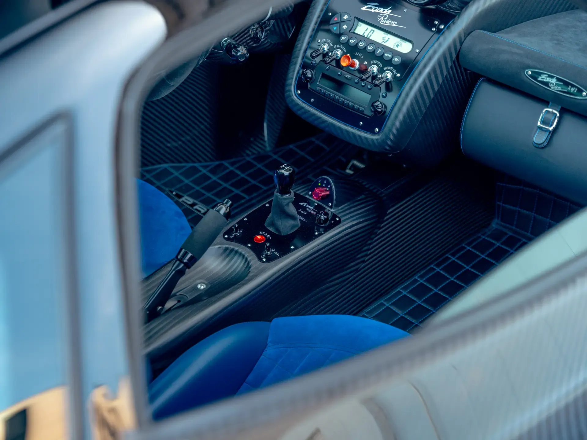 Visually, the Riviera remains one of the most distinctive interpretations of the Zonda silhouette. The exterior is finished in pearl white with exposed carbon fibre and blue accents, complemented by a 760-inspired fixed rear wing, roof scoop and carbon-fibre central fin. Inside, the cabin combines blue Alcantara with quilted black leather, retaining the analog, instrument-focused character that has made the Zonda platform a benchmark among driver-oriented hypercars. The odometer shows approximately 908 kilometres, indicating a life managed more as an investment-grade object than as a regularly driven car.