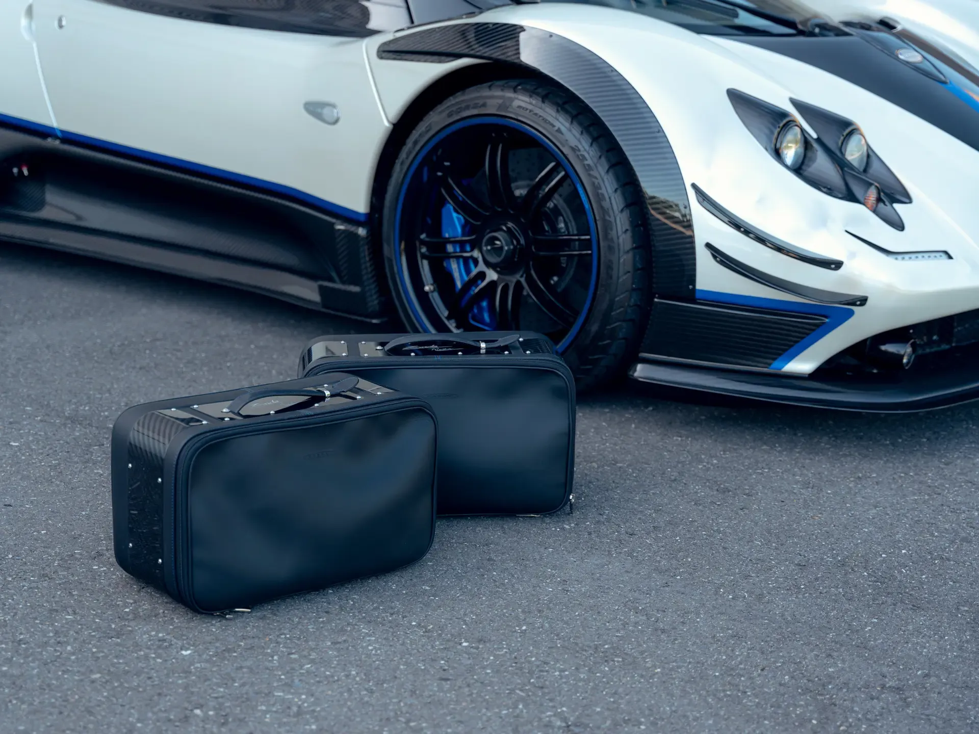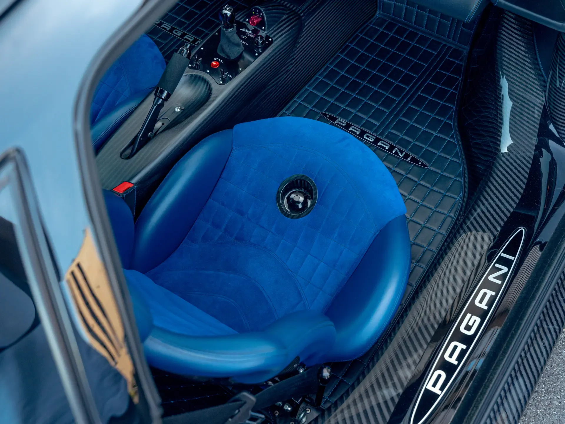 Inside, the Riviera continues this dedication to exclusivity with a cabin that balances performance-focused materials and artisanal detail. The interior pairs blue Alcantara with quilted black leather, creating a contrast that mirrors the exterior colour palette while elevating the sense of craftsmanship. The cockpit is framed by exposed carbon fibre across the console, dashboard and structural elements, reinforcing the analogue character that defines the Zonda driving experience. The sport seats, upholstered in Alcantara with contrast quilting, retain the motorsport inspiration of the original 760-series commissions, while the steering wheel and central controls showcase the typical Pagani blend of engineering precision and artistic execution. Completing the specification, the Riviera comes with its dedicated two-piece fitted luggage set, a detail appreciated by collectors assessing the completeness and originality of a pagani zonda 760 riviera example positioned at auction level.