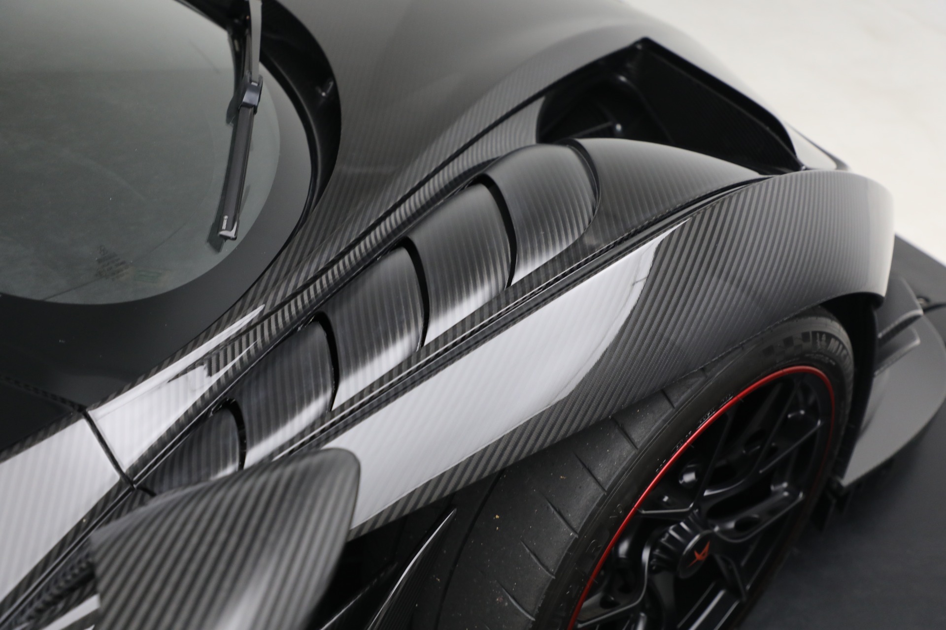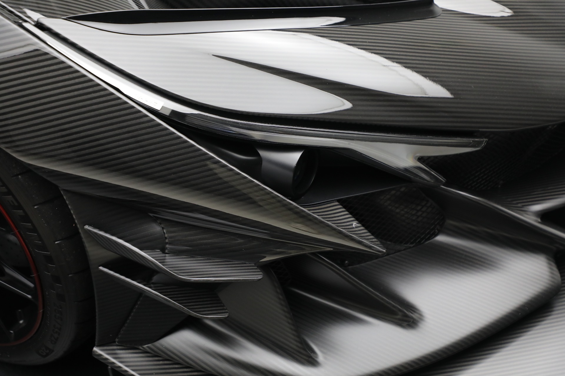 The two-seat cockpit features custom-molded carbon bucket seats. These seats are fixed directly to the monocoque chassis. Pedals and the steering wheel adjust to the driver’s position. Interior trim features extensive exposed carbon fiber elements. Upholstery is finished in luxurious Red leather or Alcantara. A six-point racing harness ensures driver security. The driver controls systems via the complex racing steering wheel. A digital instrument cluster displays all critical data