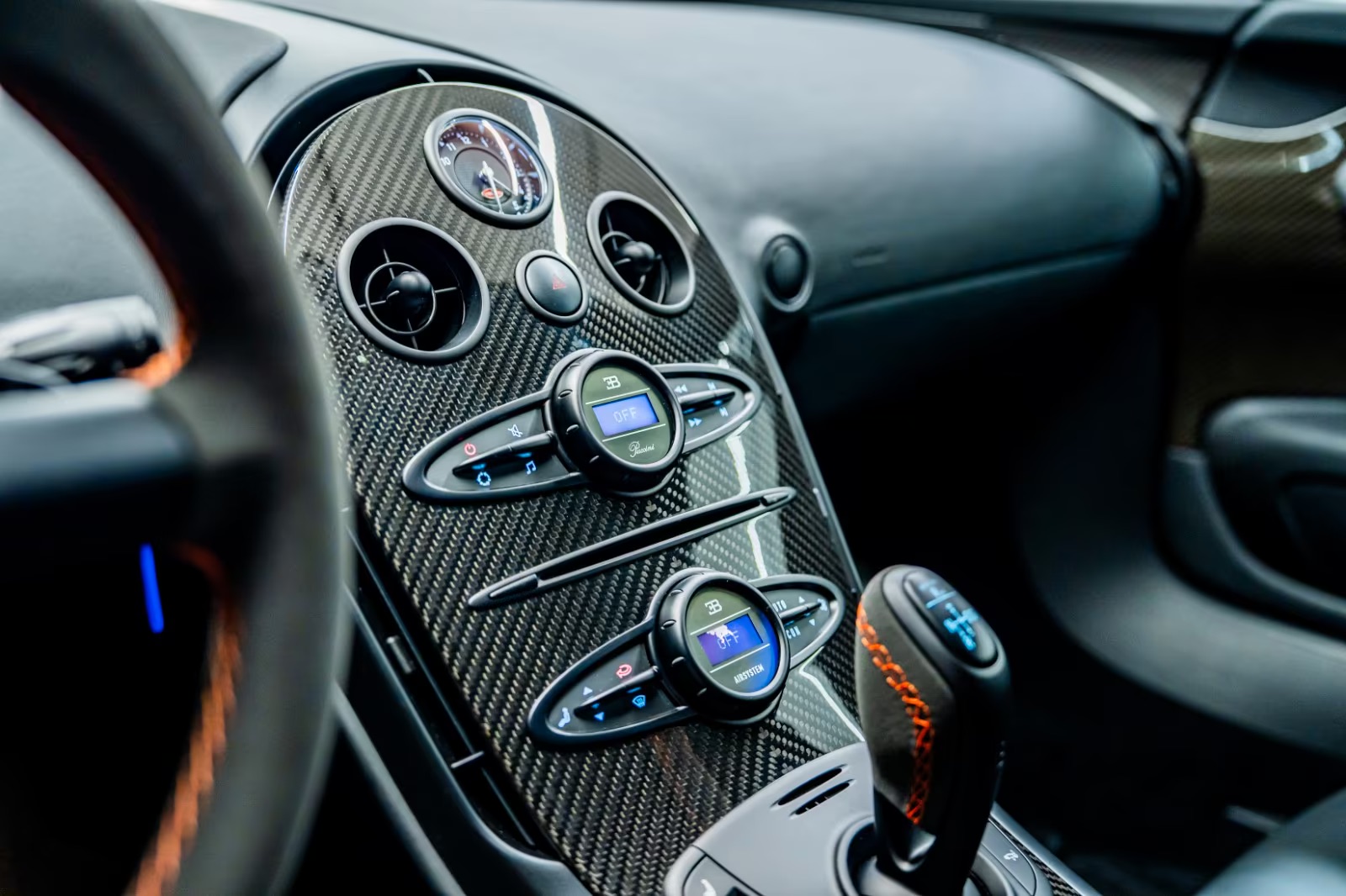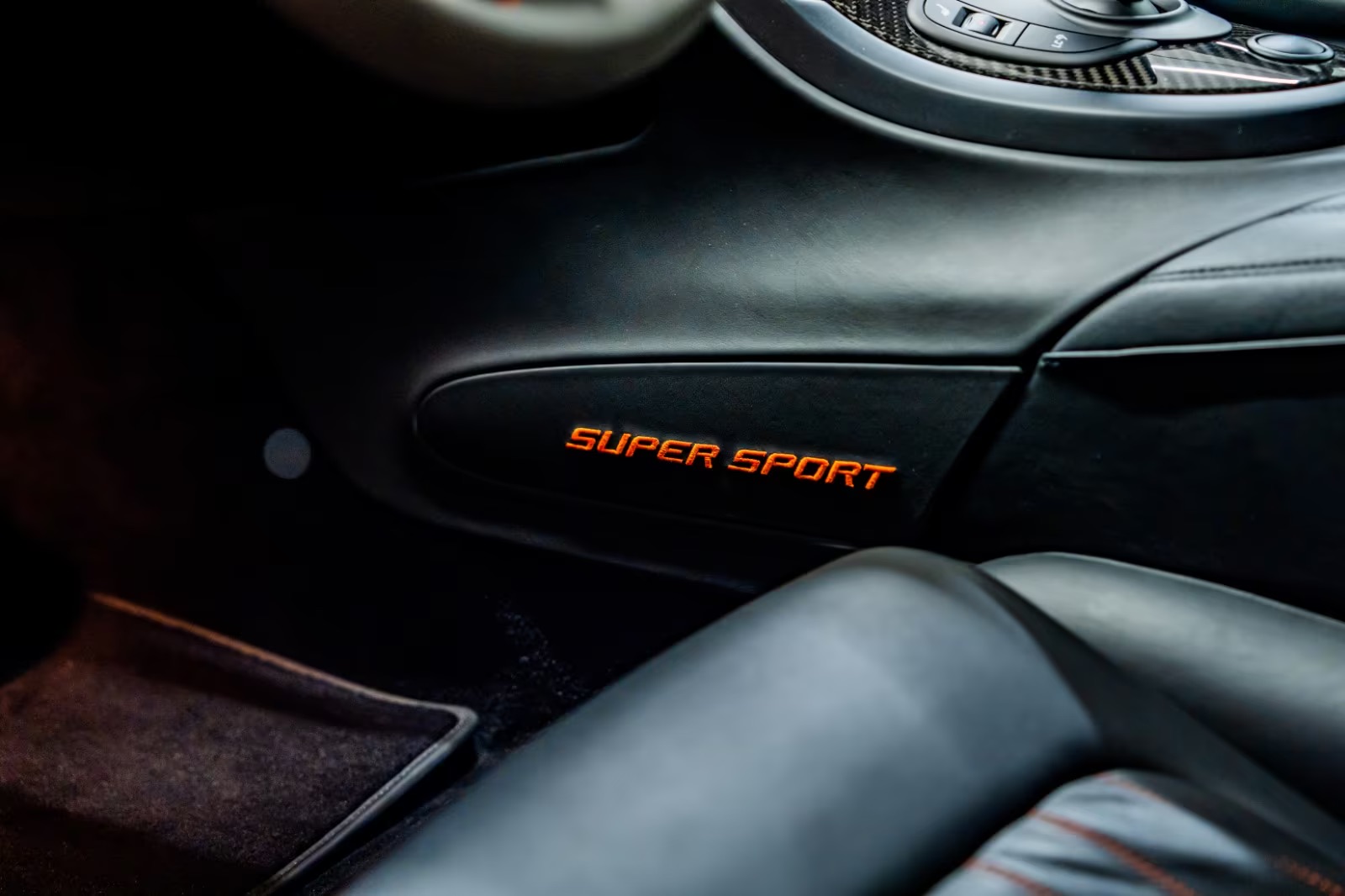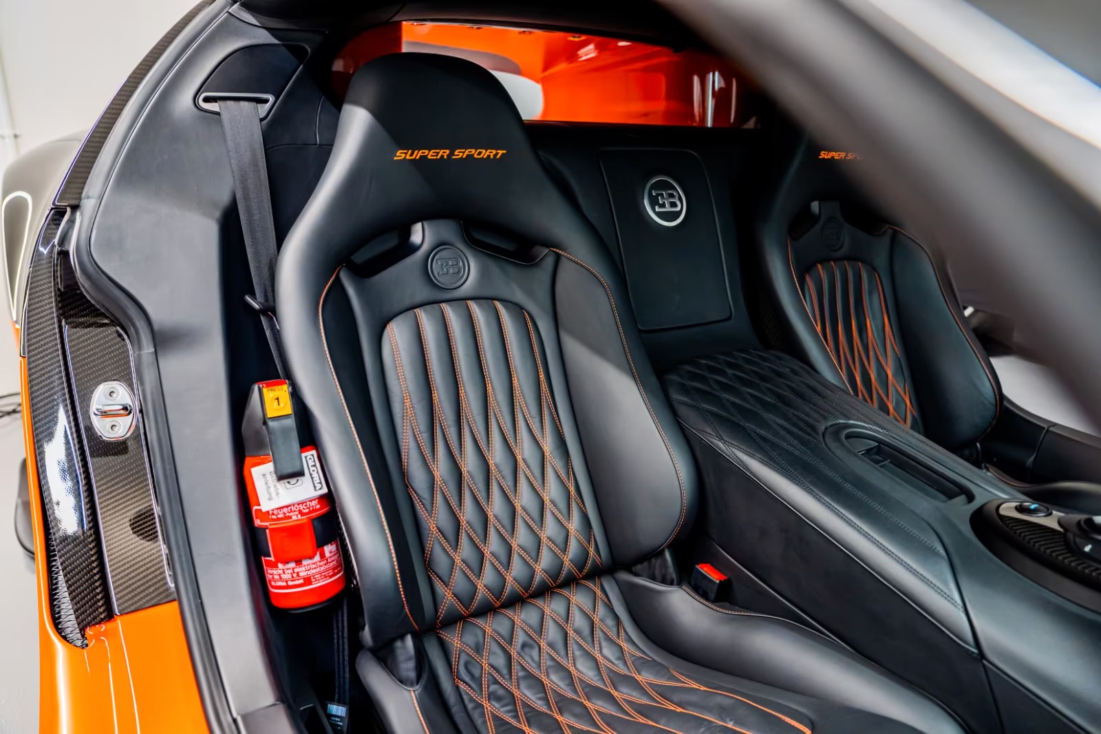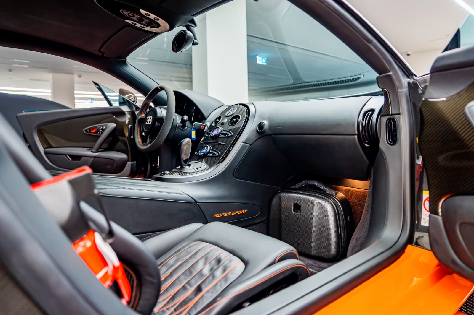 The interior of this Bugatti Veyron Super Sport World Record Edition is trimmed in Black Full Leather with orange contrast stitching, maintaining continuity with the exterior configuration. Interior materials consist of hand-finished leather surfaces, aluminum structural elements, and carbon fiber components. The cabin layout follows the Super Sport architecture, retaining the original analog-digital instrumentation used by Bugatti during this production era. The interior condition remains consistent with extremely low mileage and controlled storage since delivery.