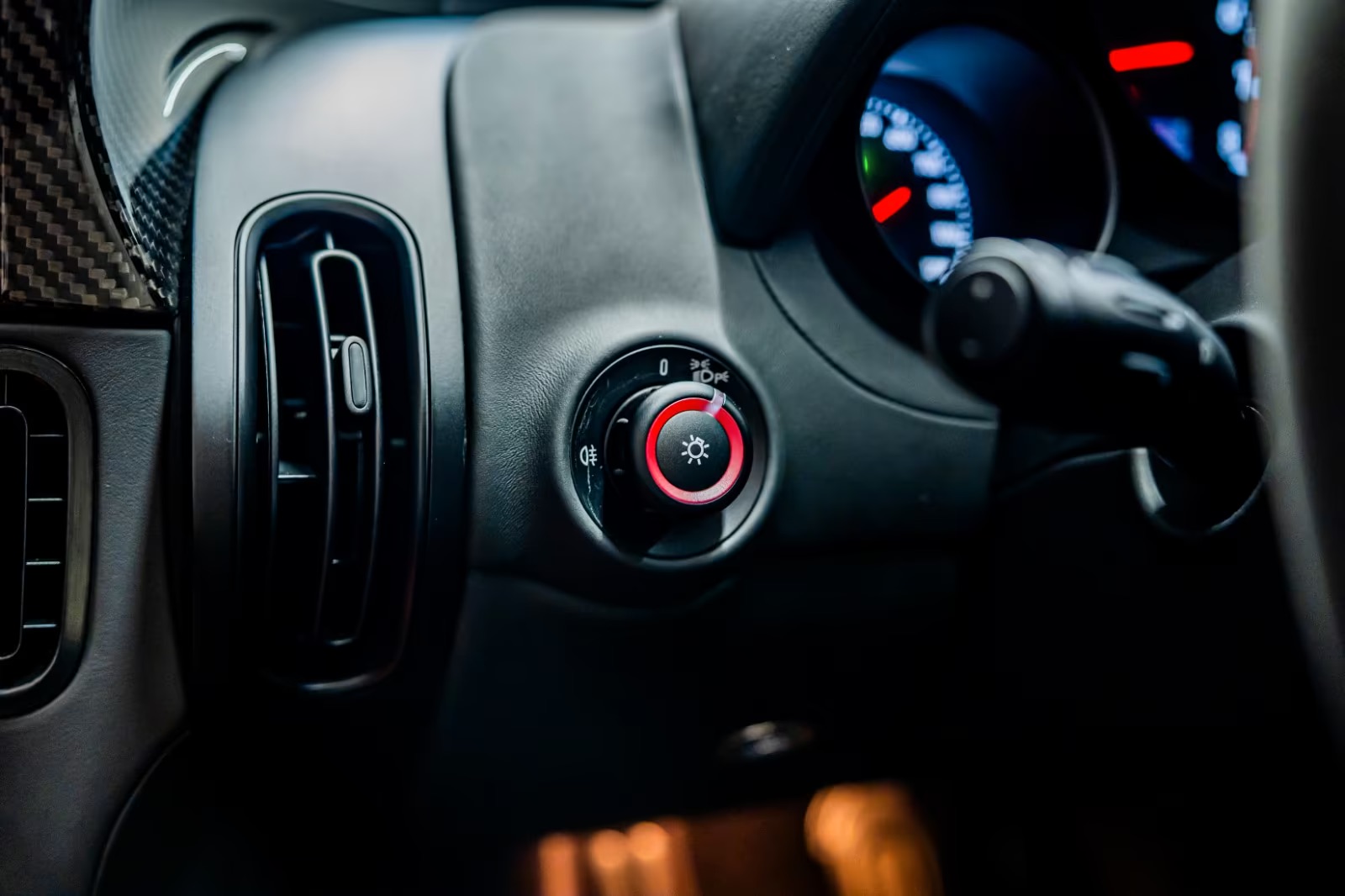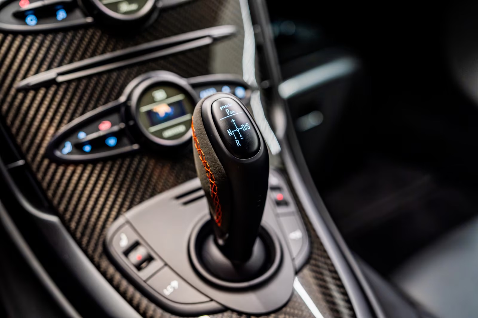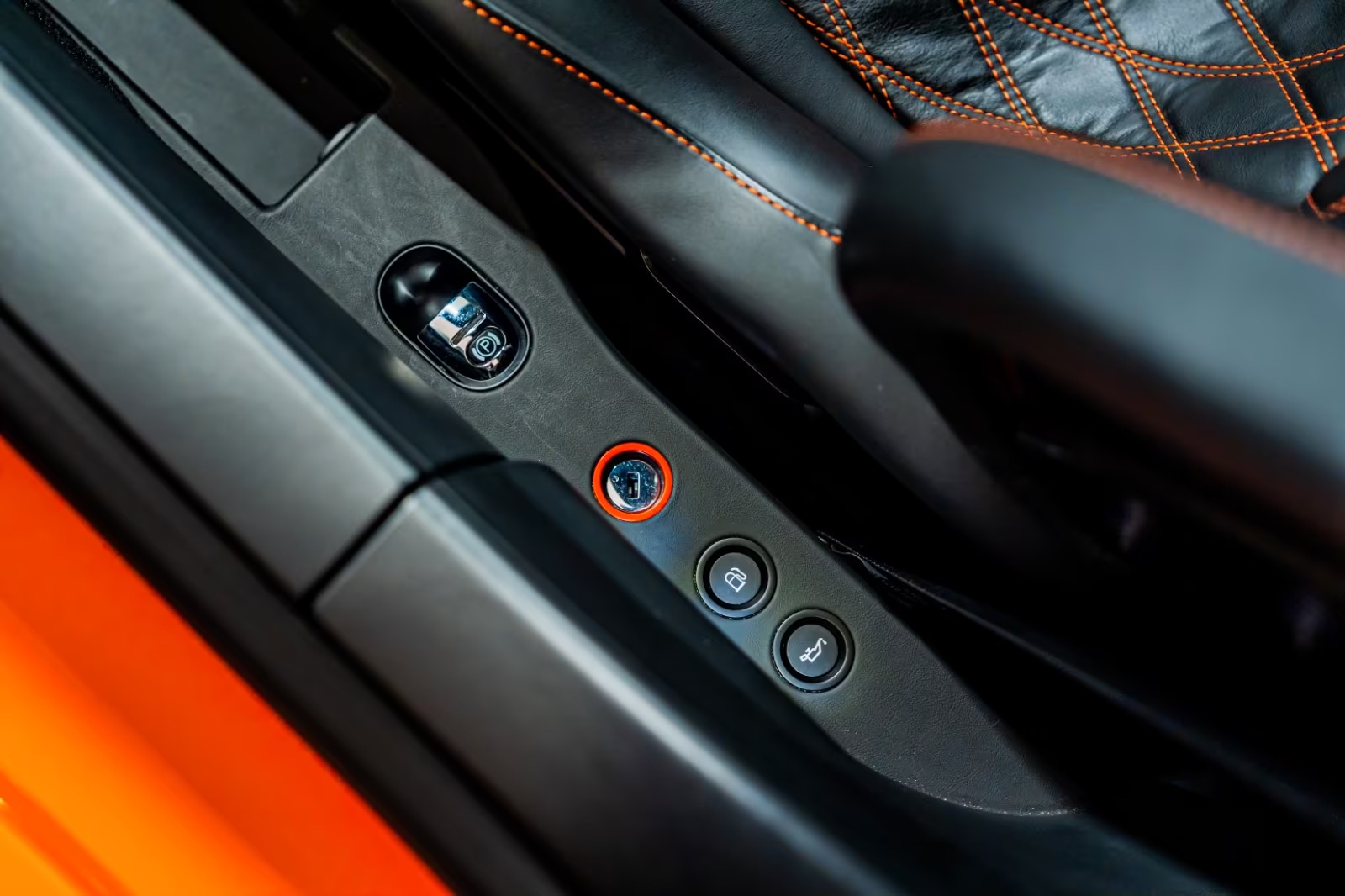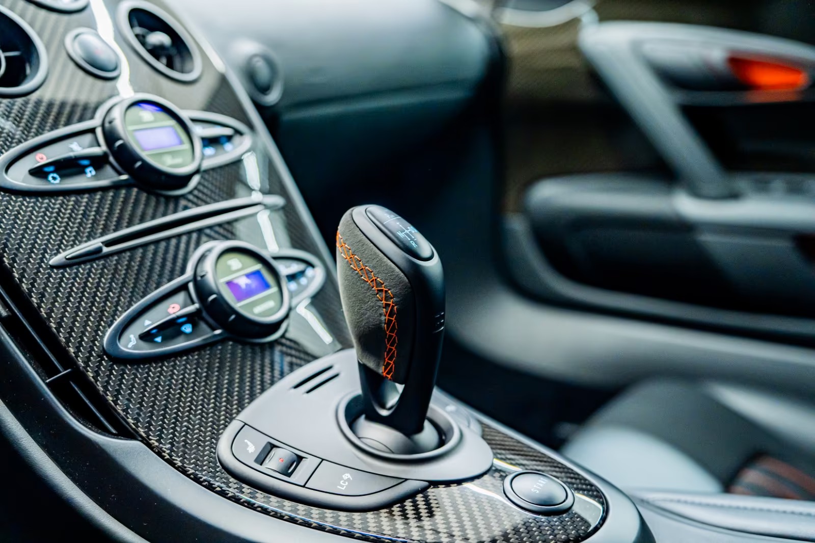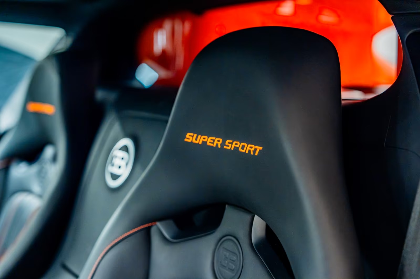 The interior of this Bugatti Veyron Super Sport World Record Edition is trimmed in Black Full Leather with orange contrast stitching, maintaining continuity with the exterior configuration. Interior materials consist of hand-finished leather surfaces, aluminum structural elements, and carbon fiber components. The cabin layout follows the Super Sport architecture, retaining the original analog-digital instrumentation used by Bugatti during this production era. The interior condition remains consistent with extremely low mileage and controlled storage since delivery.