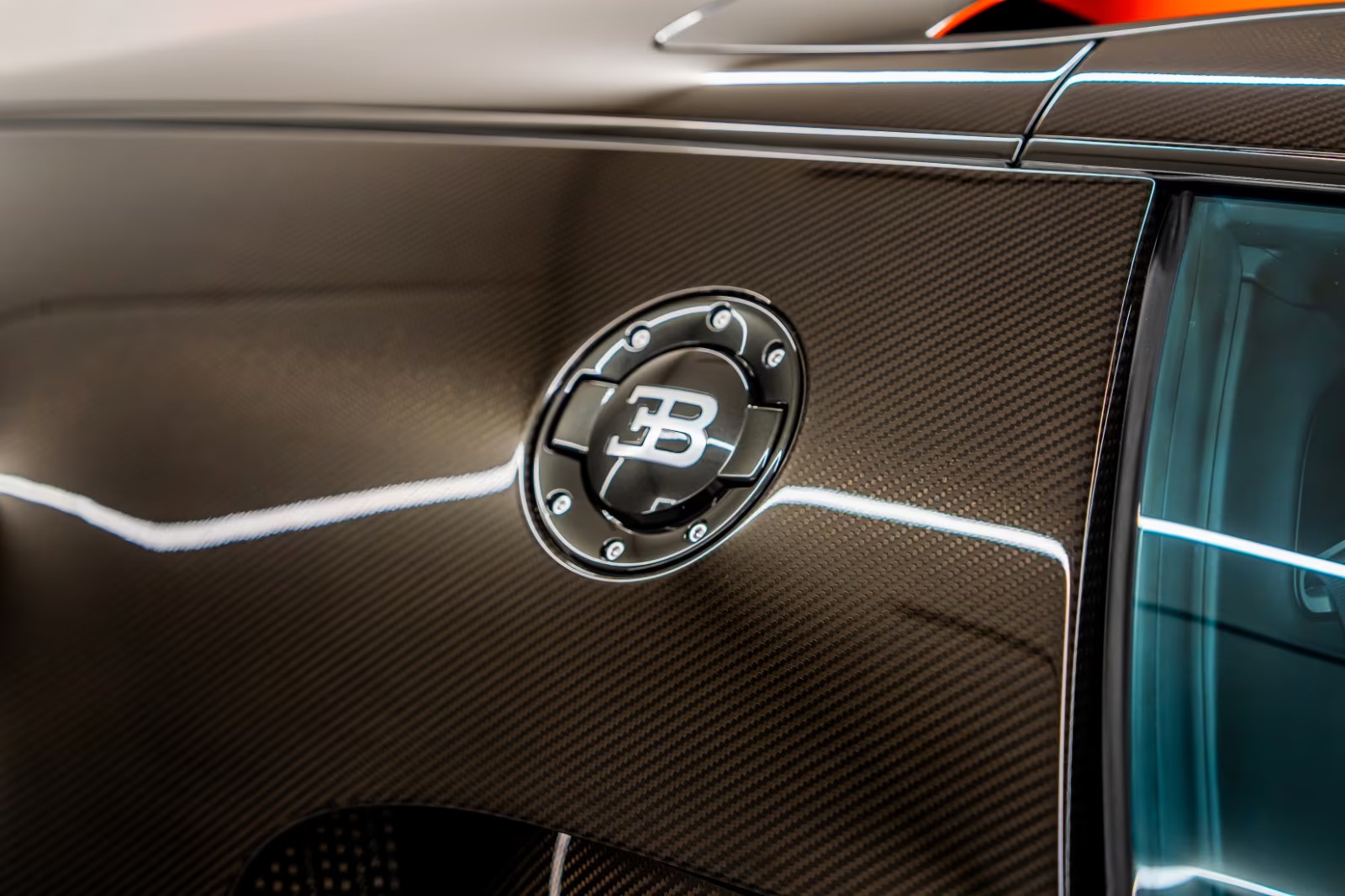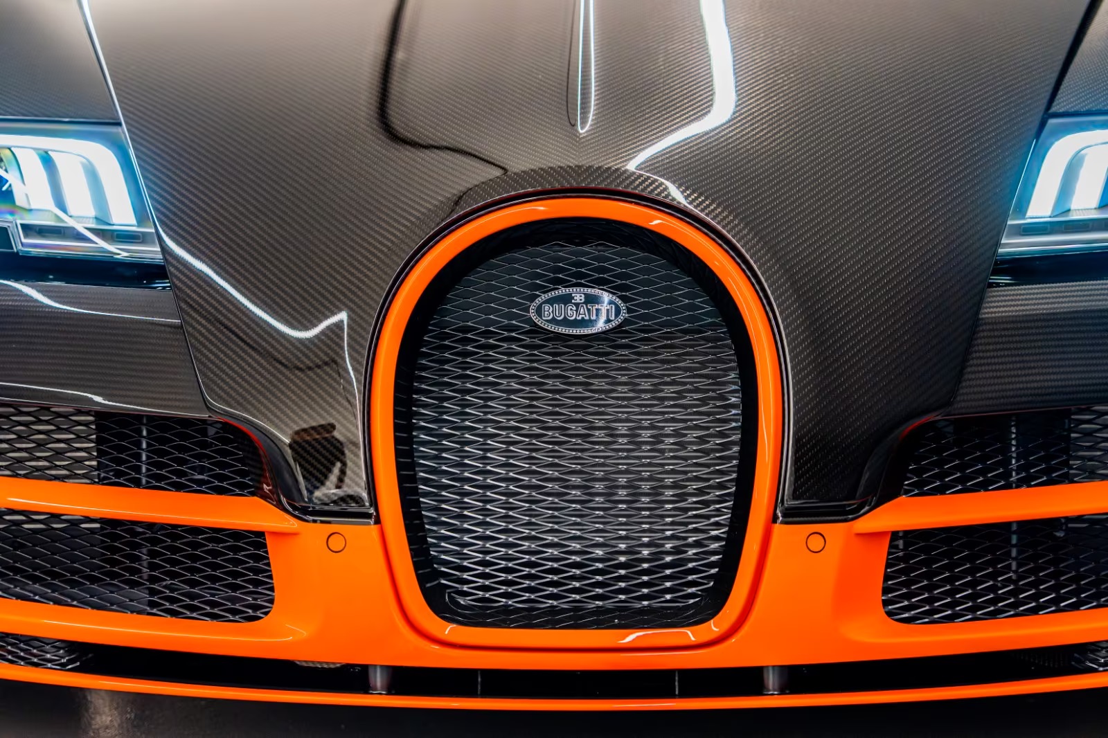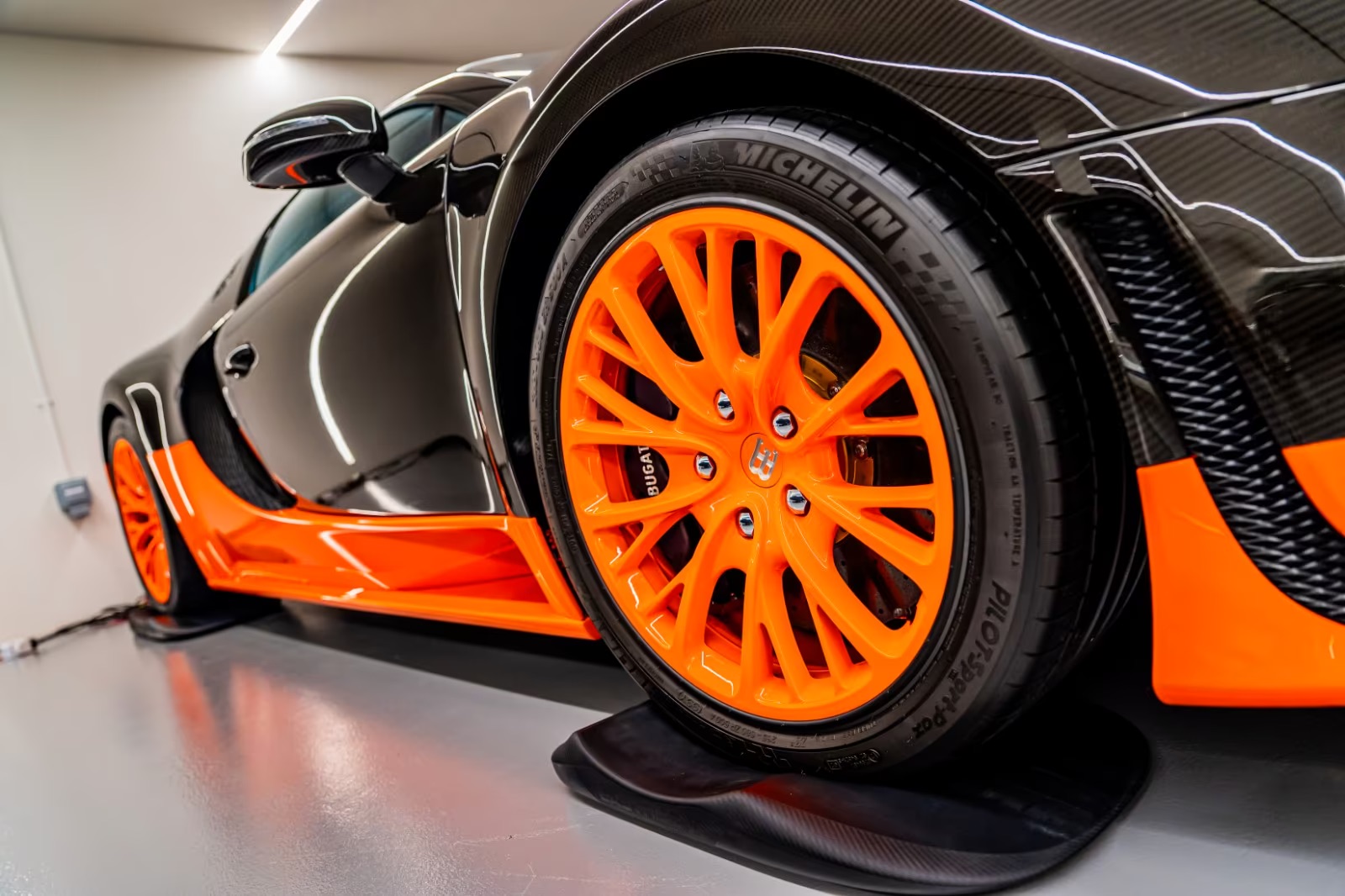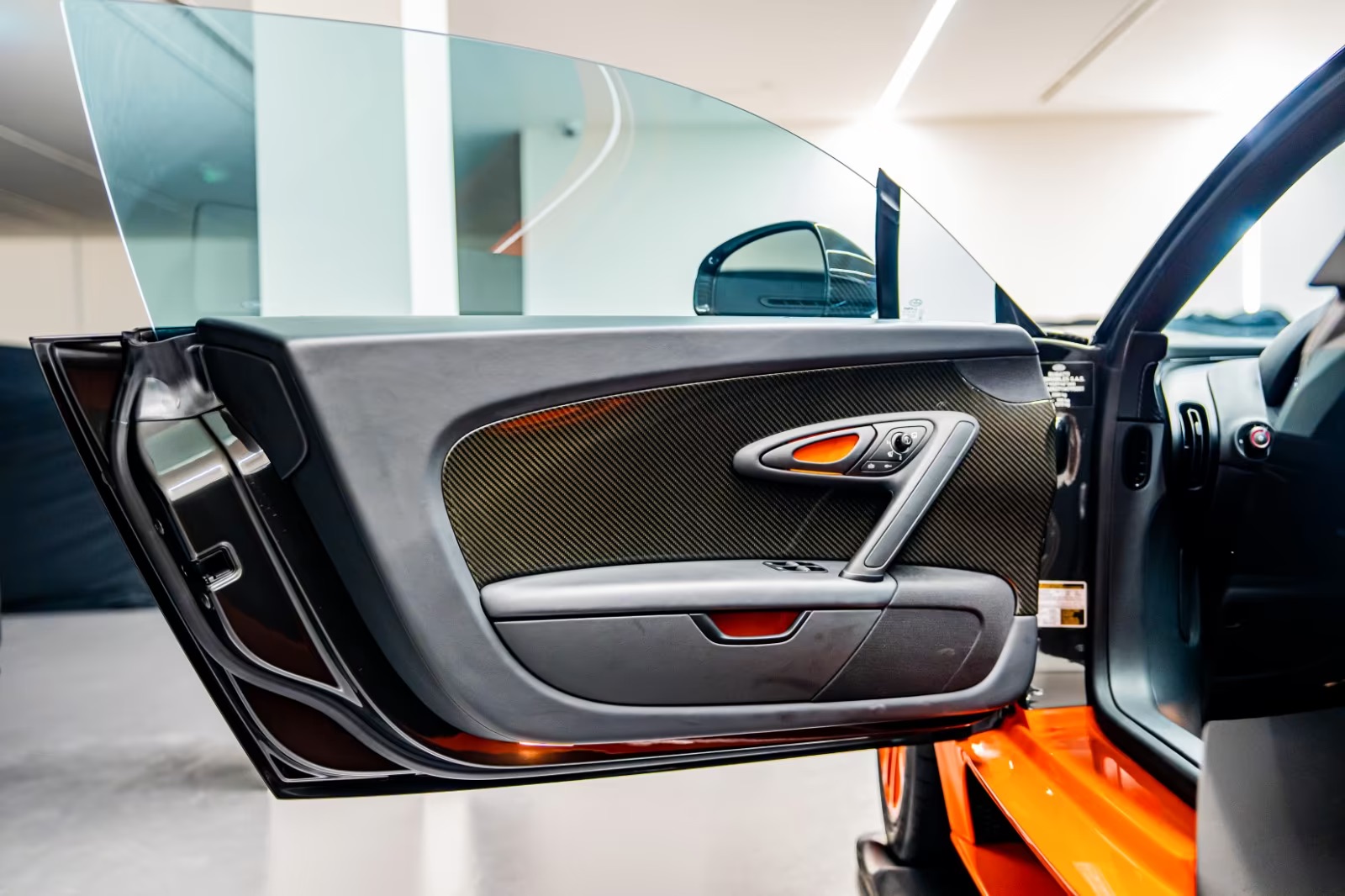 This Bugatti Veyron Super Sport World Record Edition for sale is finished in Black Exposed Carbon with Orange accents, a configuration reserved exclusively for the World Record Edition specification. The exposed carbon body panels reflect the lightweight construction developed to achieve record-breaking performance. Exterior detailing follows factory World Record Edition standards, including specific aerodynamic revisions compared to the standard Veyron Super Sport. The visual specification directly corresponds to the model used during the official top-speed certification.