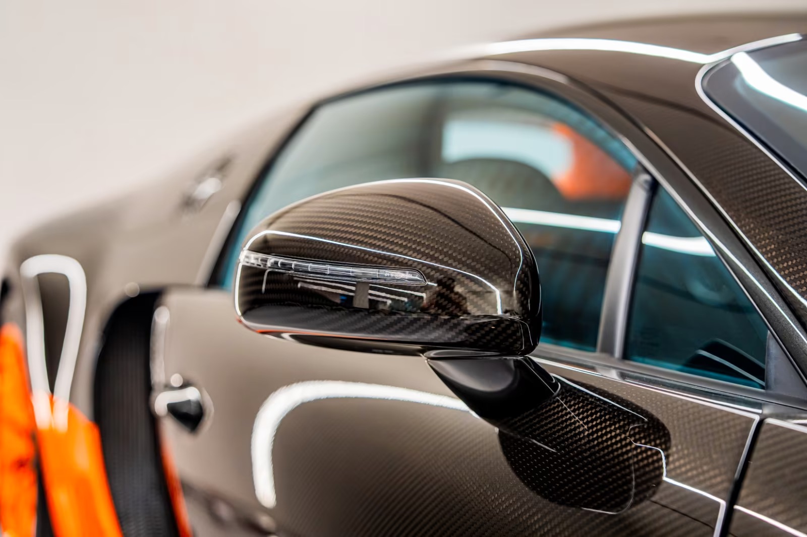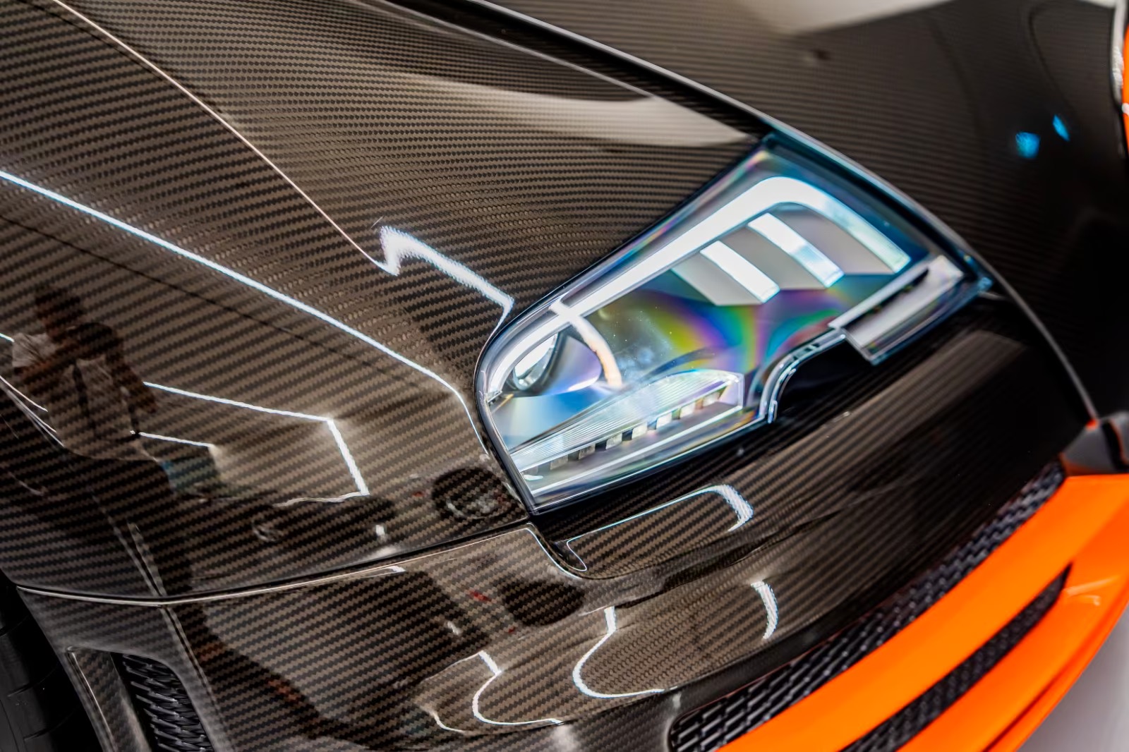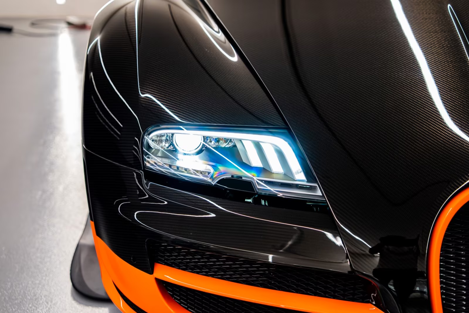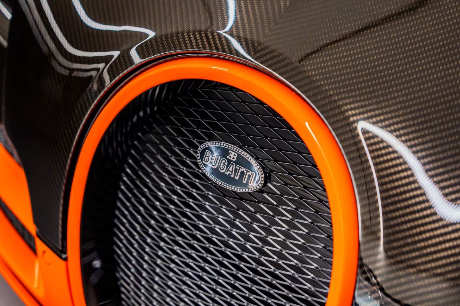 This Bugatti Veyron Super Sport World Record Edition for sale is finished in Black Exposed Carbon with Orange accents, a configuration reserved exclusively for the World Record Edition specification. The exposed carbon body panels reflect the lightweight construction developed to achieve record-breaking performance. Exterior detailing follows factory World Record Edition standards, including specific aerodynamic revisions compared to the standard Veyron Super Sport. The visual specification directly corresponds to the model used during the official top-speed certification.