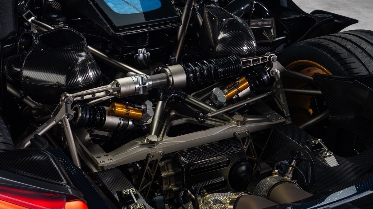 The powertrain is a 5.0L twin-turbocharged aluminum V8. The engine generates 1,280 hp when running on standard gasoline. Power output reaches 1,600 hp on E85 biofuel. Maximum torque is rated at 1,500 Nm at 5,100 RPM. The mid-mounted engine utilizes a lightweight flat-plane crankshaft. The system is mated to the 9-speed Light Speed Transmission. All power is delivered exclusively to the rear wheels. Acceleration from 0–100 km/h is achieved in only 2.5 seconds. The 0–200 km/h sprint takes approximately 5.5 seconds. The maximum speed is electronically capped at 480 km/h.