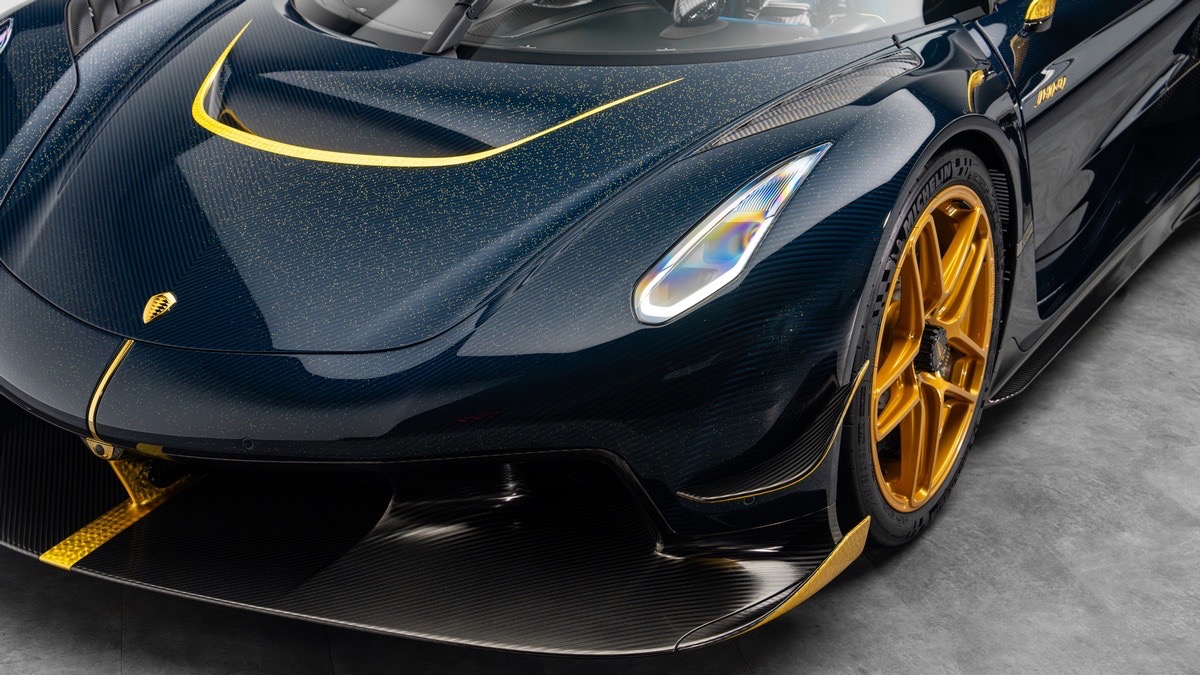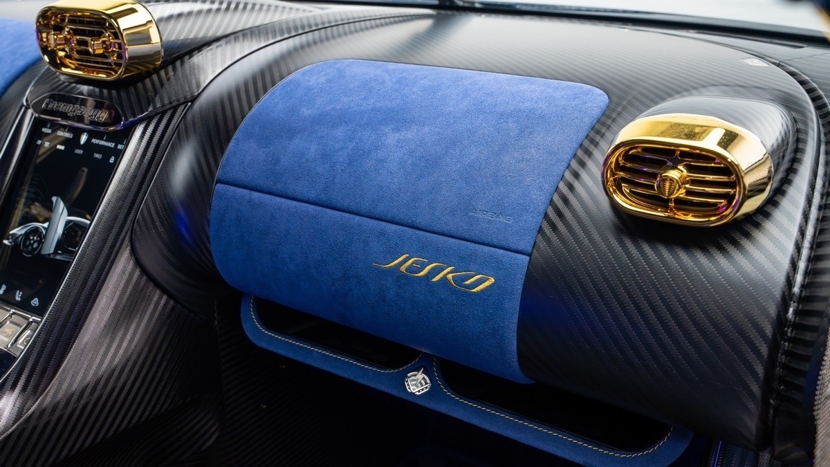 This Koenigsegg Jesko Attack is offered by Alain Class Motors in Dubai, United Arab Emirates. The vehicle is a 2025 model year example with 0 km mileage, presented in factory-new condition. Exterior specification features Blue Tinted Carbon Fibre with integrated Gold Flakes, a finish that positions this car among the most visually distinctive Jesko Attack configurations produced. The use of gold-infused elements recalls the approach seen on highly bespoke Jesko builds, including the Jesko Attack “Odin”, previously offered at 18,500,000 AED, approximately $5,036,754 USD, reinforcing the premium associated with precious-material specifications.