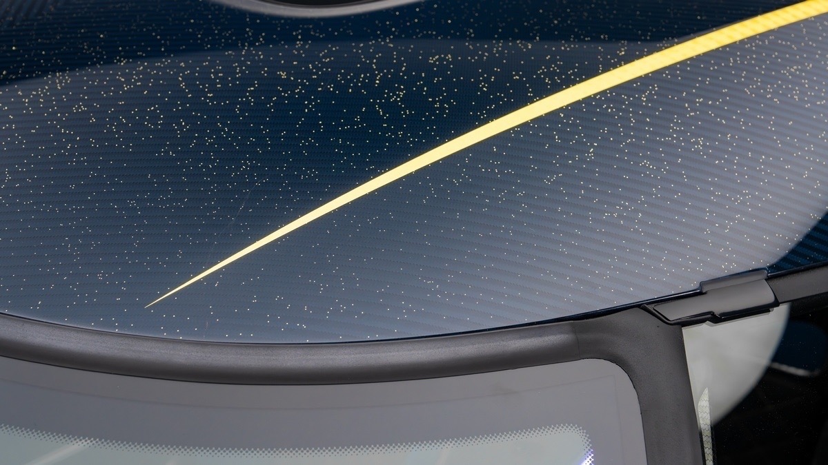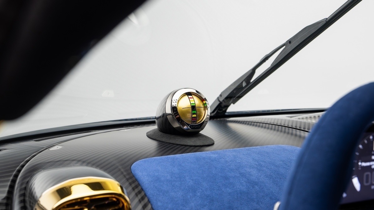 The interior of this unit is trimmed in Night Sky Alcantara. Desiato Alcantara accents provide a refined contrast inside this cabin. The carbon fiber sport seats utilize advanced memory foam technology. The steering wheel incorporates two haptic SmartWheel touchscreens for control. A 5-inch SmartCluster display is fixed to the steering column. This car includes a precision analogue G-force meter on the dashboard. The cockpit features polished aluminum and visible carbon fiber elements. Every detail in this space focuses on a technical track experience.