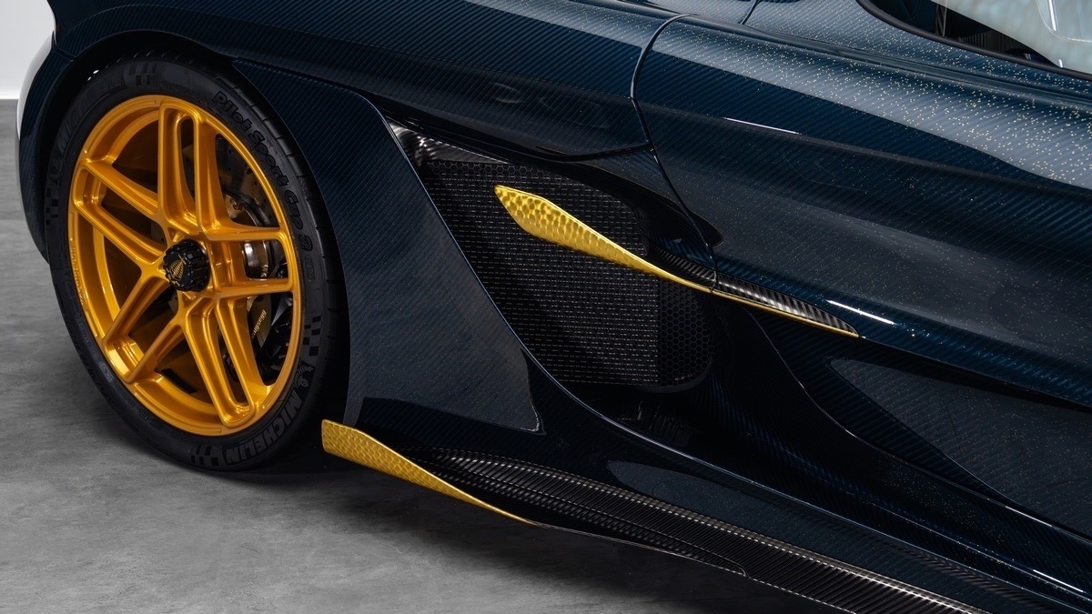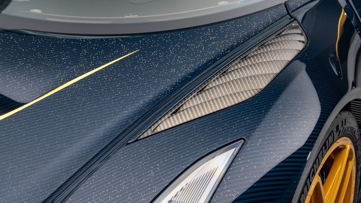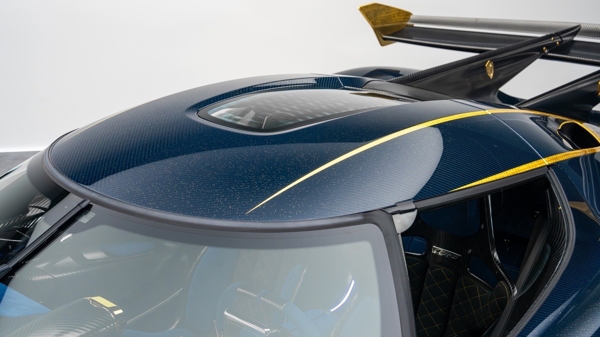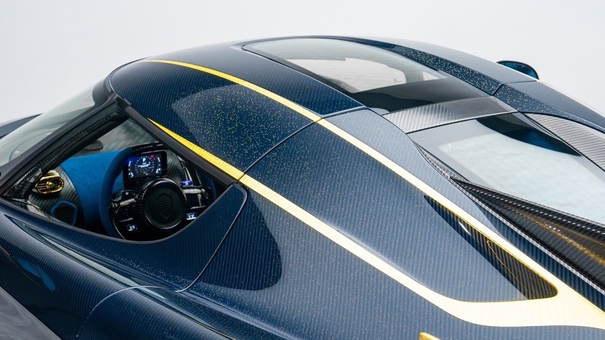 The body of this car displays a Blue Tinted Carbon Fibre finish. This bespoke weave includes real Gold Flakes for a unique shimmer. The Attack variant employs a sophisticated high-downforce aerodynamic package. The configuration includes a prominent top-mounted active rear wing. The front of this unit features a deep splitter with active flaps. This car rides on carbon fiber AirCore wheels to reduce mass. All exterior logos on this example feature a Gold Leaf application. The underlying chassis consists of a rigid carbon fiber monocoque.