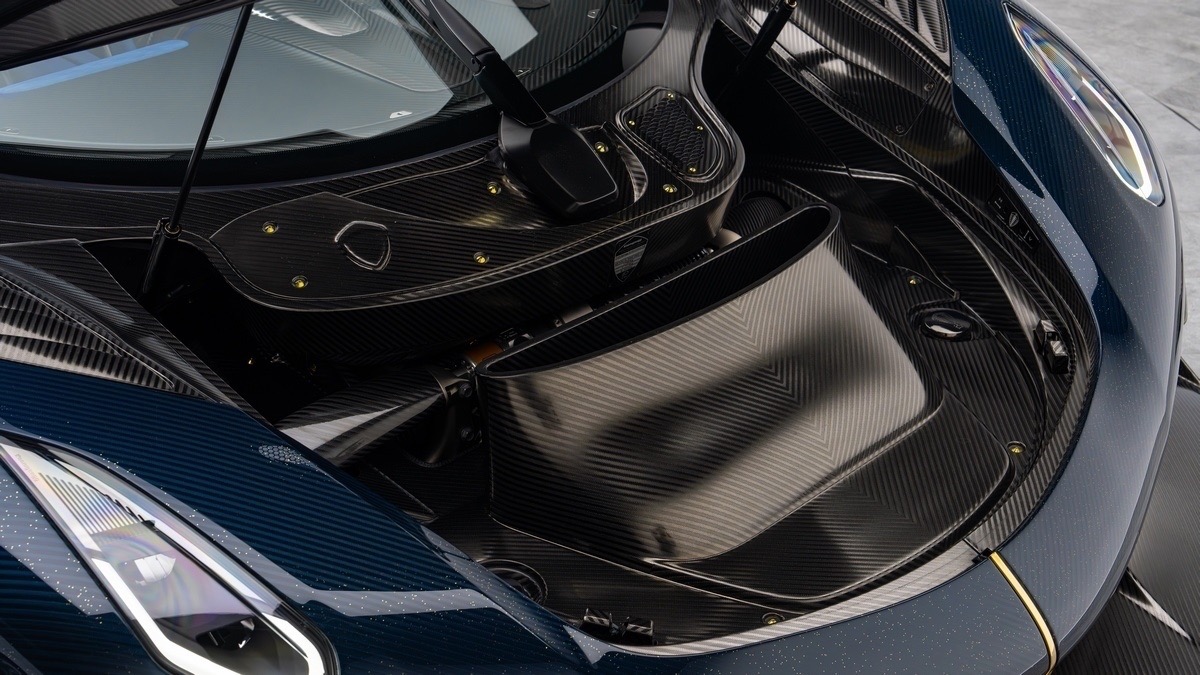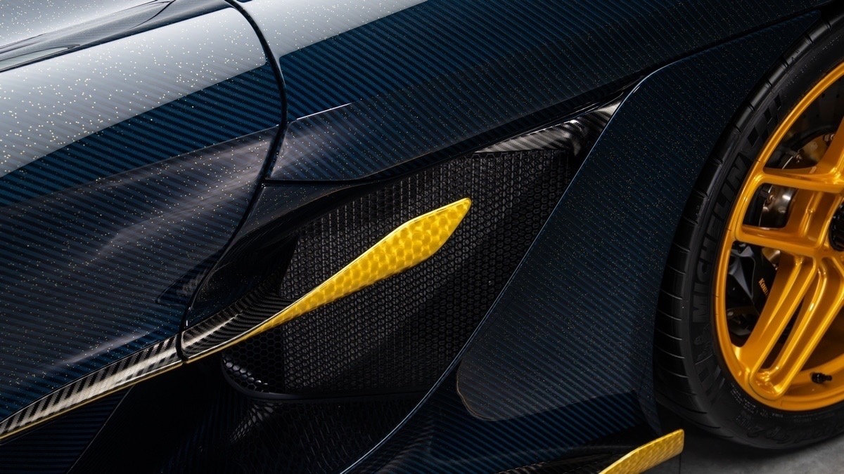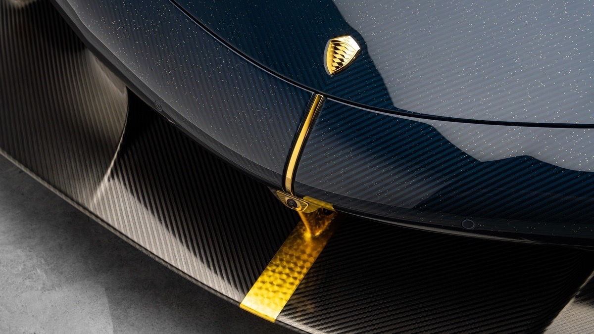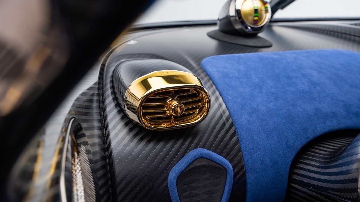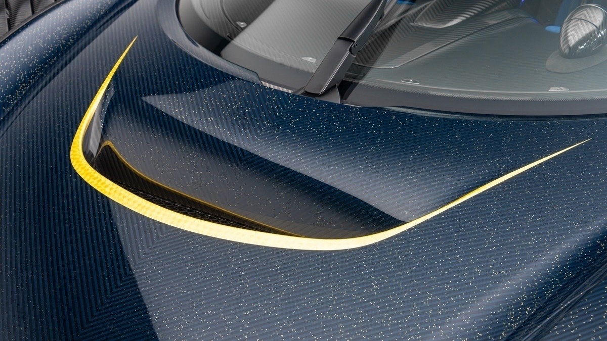 The body of this car displays a Blue Tinted Carbon Fibre finish. This bespoke weave includes real Gold Flakes for a unique shimmer. The Attack variant employs a sophisticated high-downforce aerodynamic package. The configuration includes a prominent top-mounted active rear wing. The front of this unit features a deep splitter with active flaps. This car rides on carbon fiber AirCore wheels to reduce mass. All exterior logos on this example feature a Gold Leaf application. The underlying chassis consists of a rigid carbon fiber monocoque.