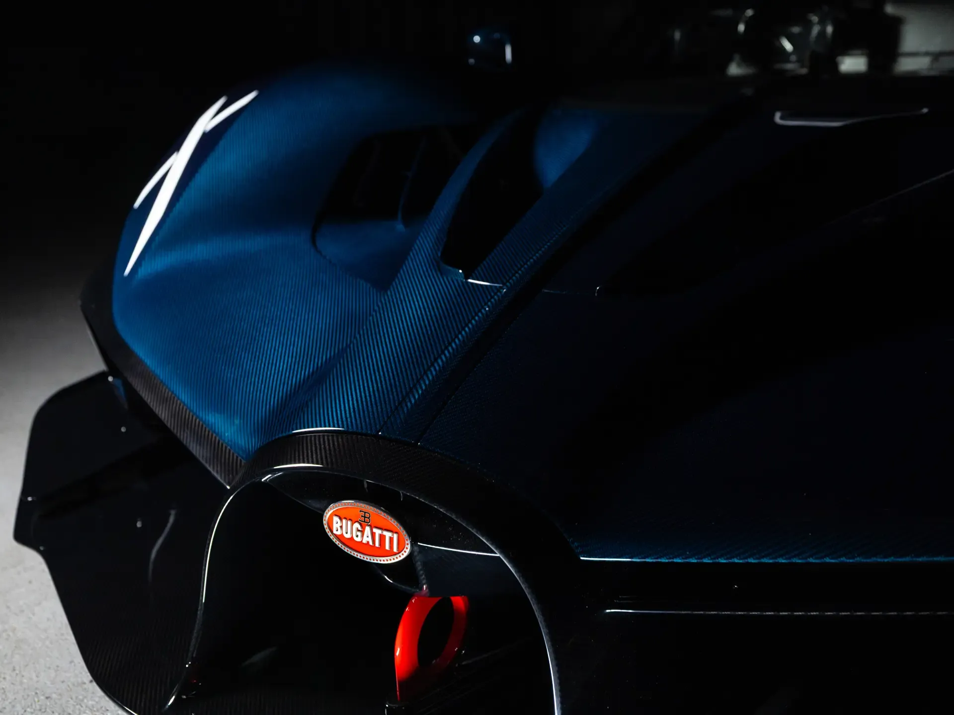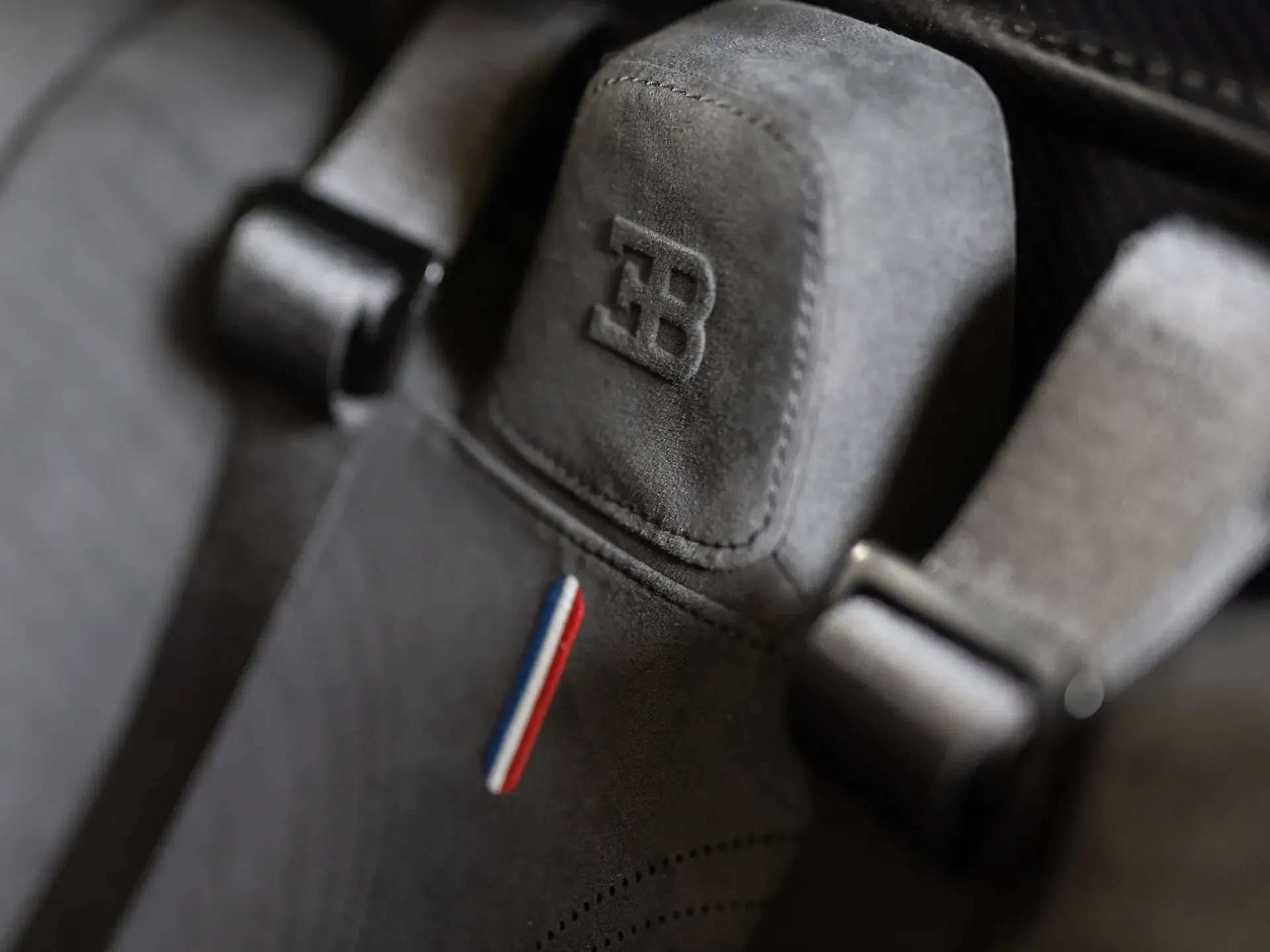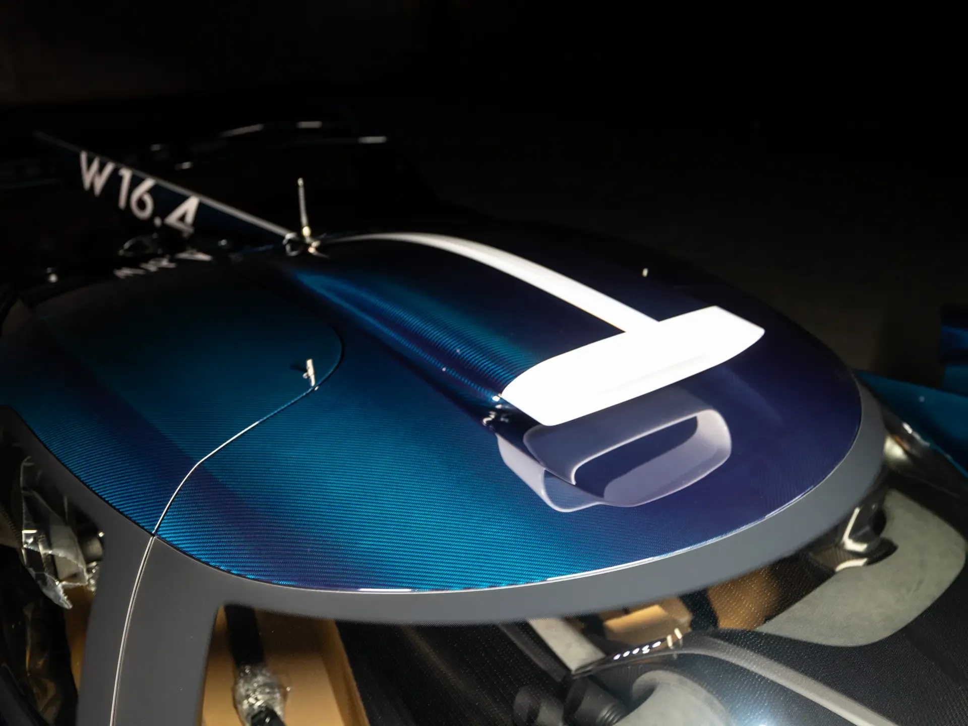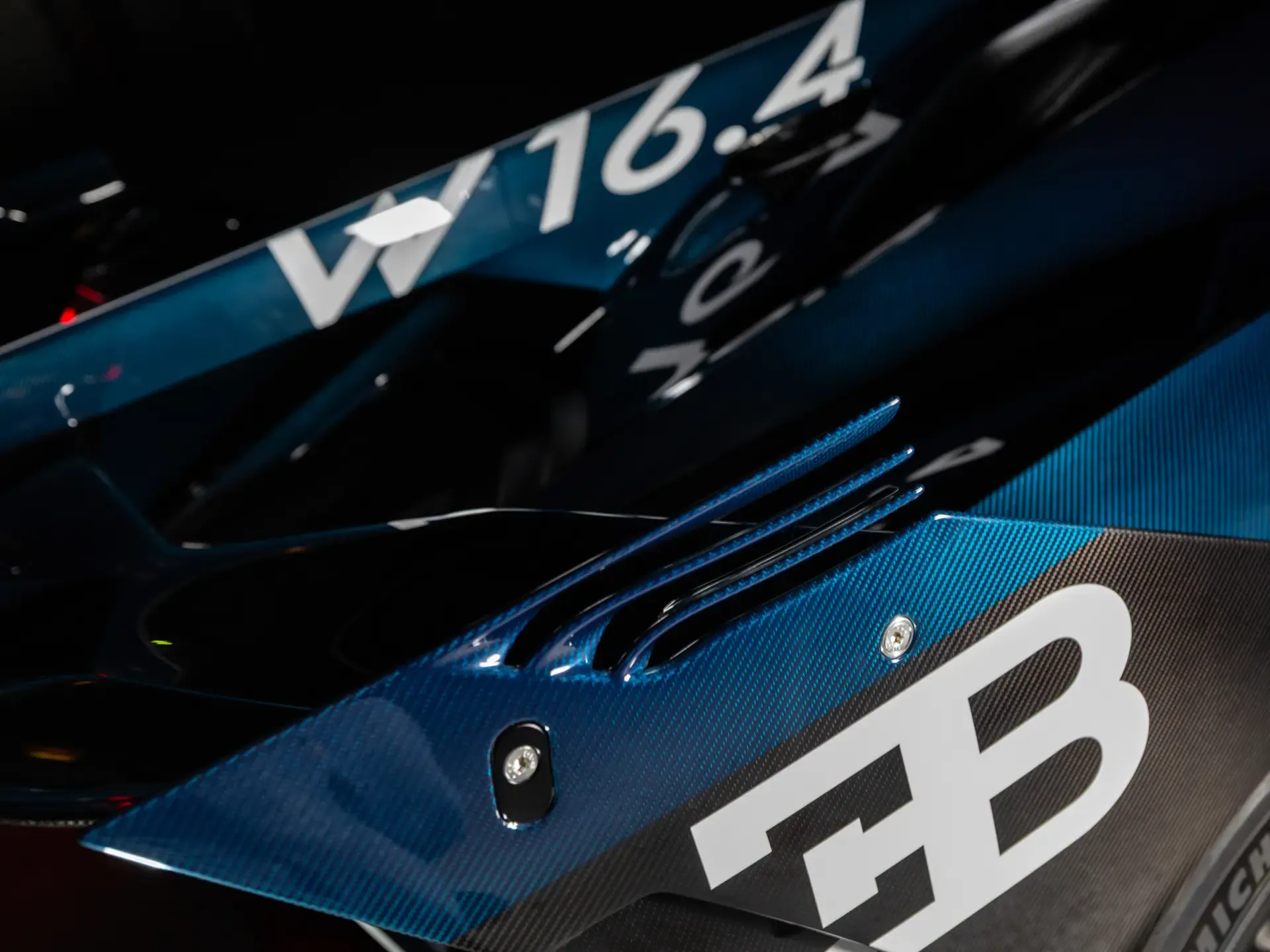 The exterior is Turquoise Carbon with Black Carbon accents—a striking combination on a carbon-fibre monocoque track coupé. Lower aero-linked panels are finished in Black Carbon, while the turning vanes carry subtle French flag motifs. The central intake surround? Blanc. The tow hook? Italian Red. Fuel cap and exhaust deflector stay Black. Wheels are painted Nocturne with Black centre caps, and a stabiliser fin carries the W16.4 badge alongside Bugatti script. Rear wing endplates display the Bugatti logo.