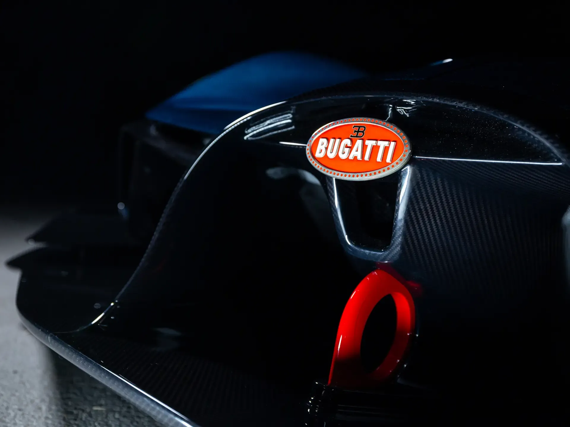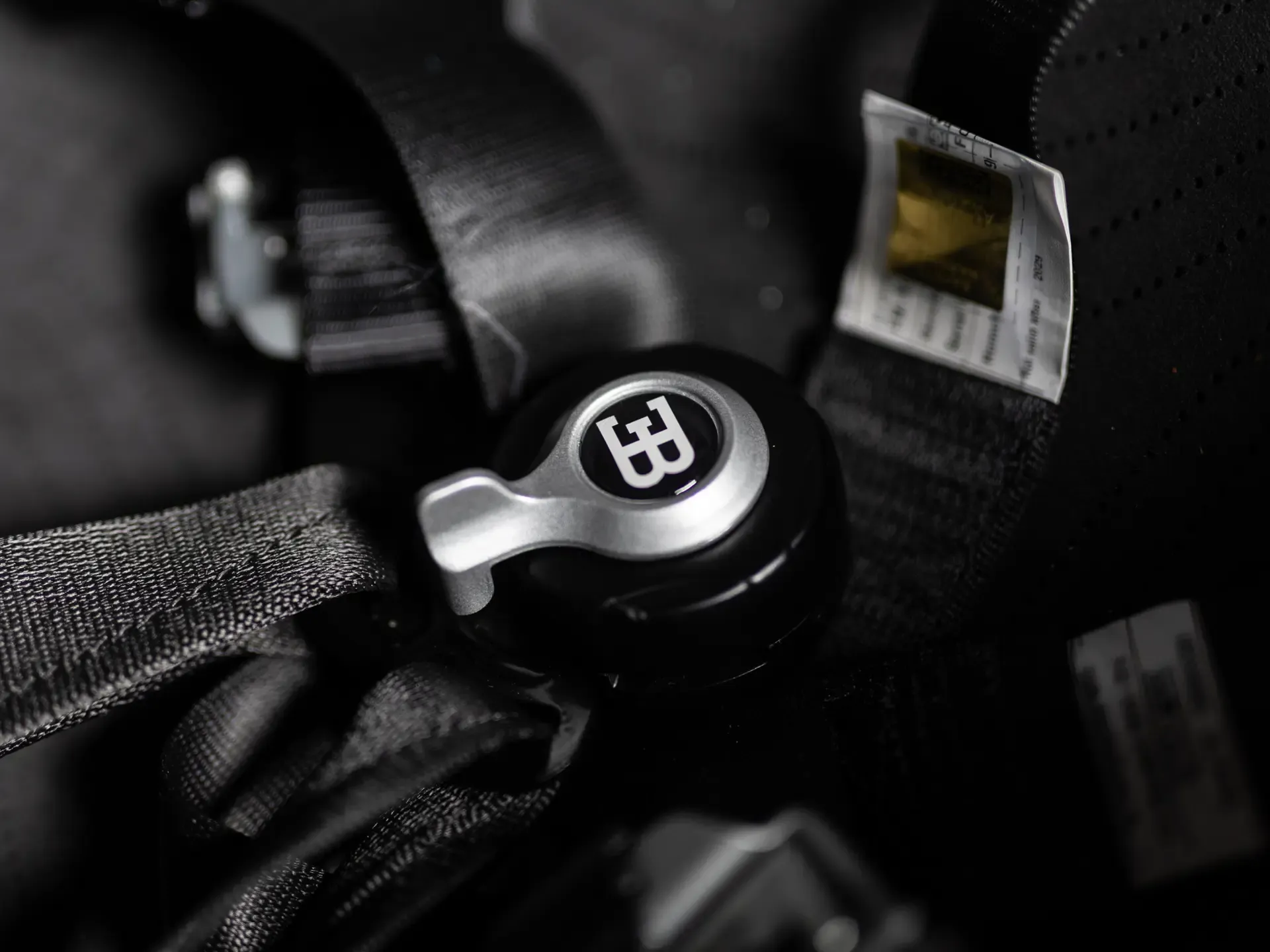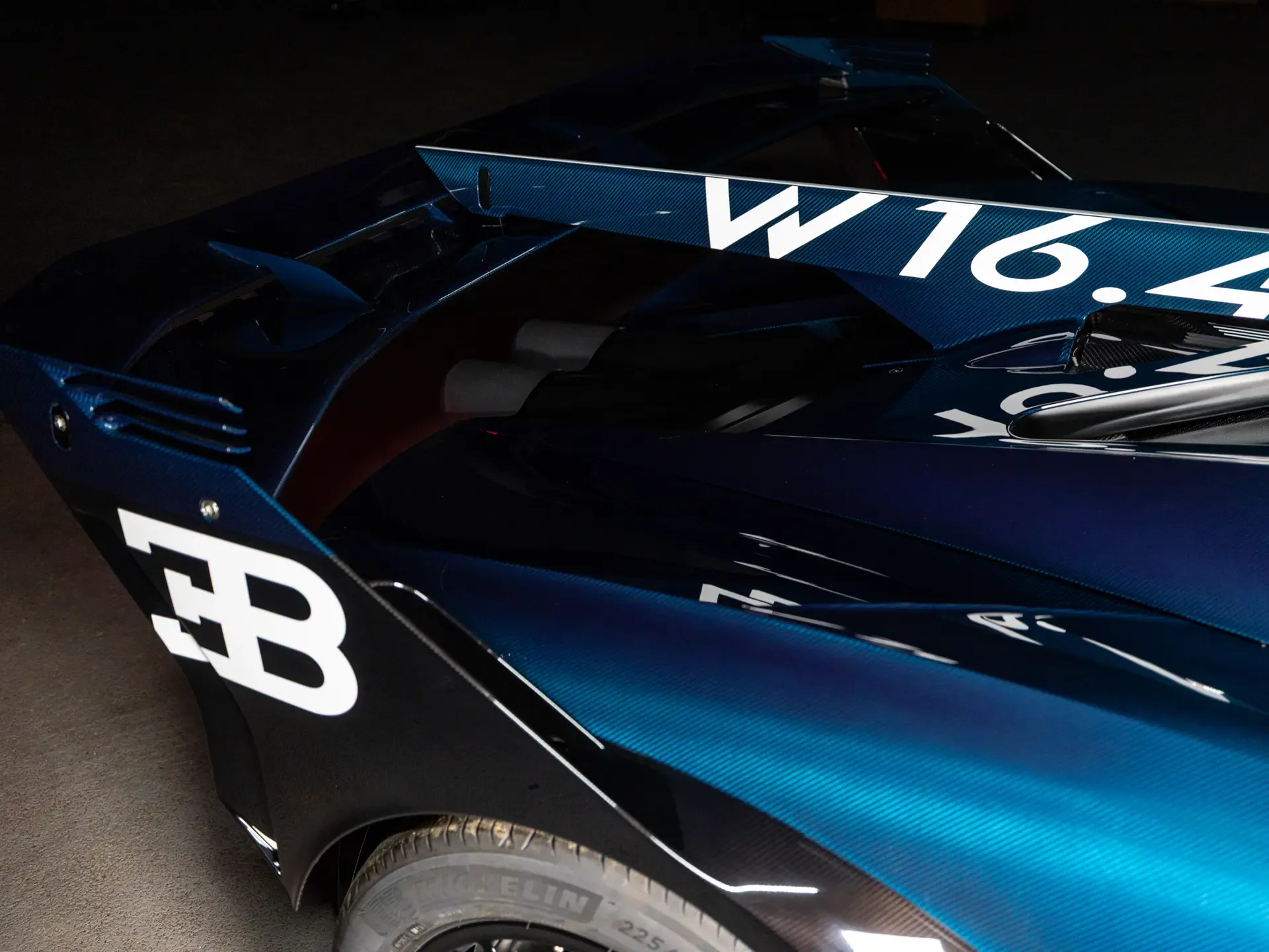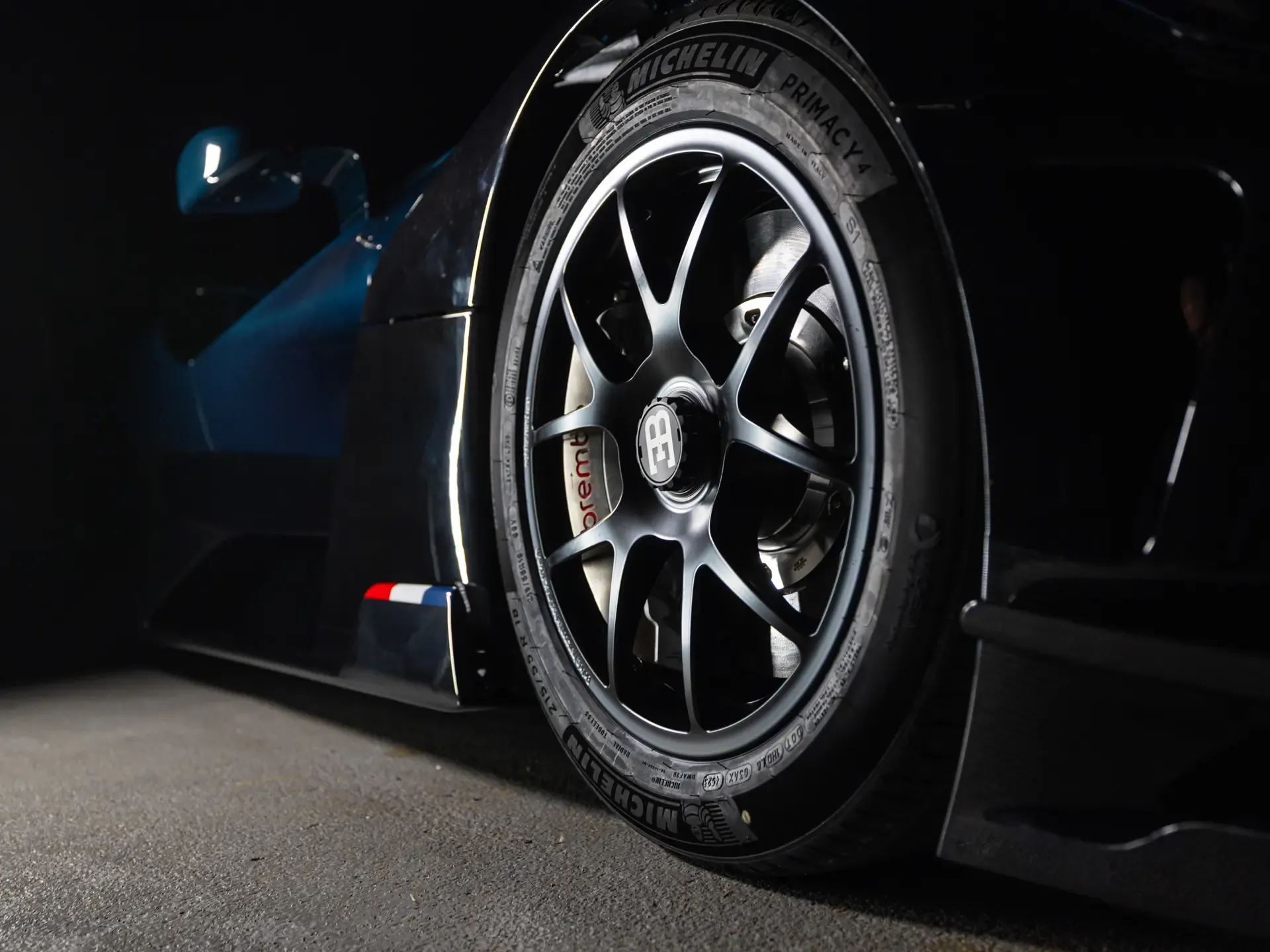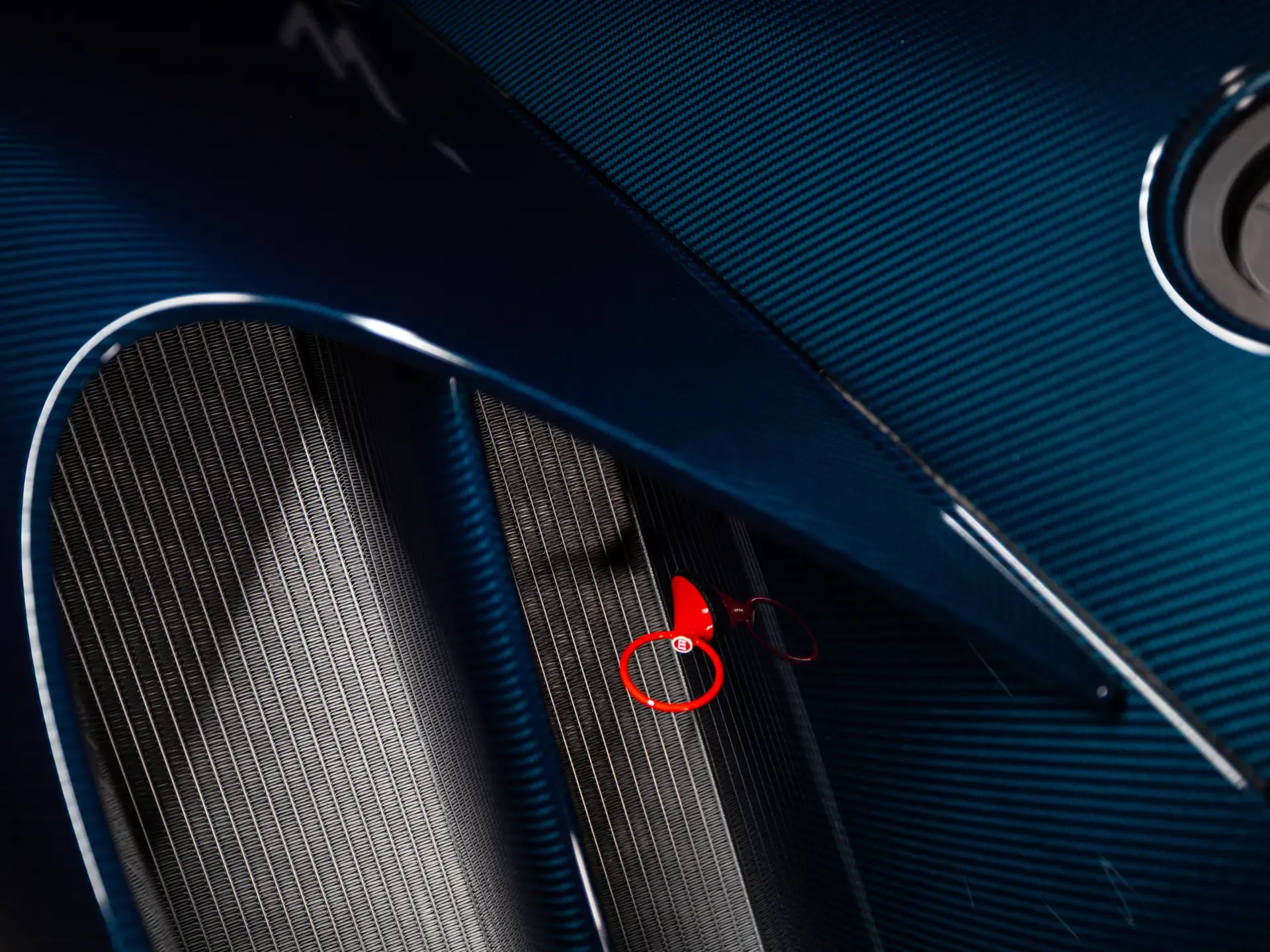 The exterior is Turquoise Carbon with Black Carbon accents—a striking combination on a carbon-fibre monocoque track coupé. Lower aero-linked panels are finished in Black Carbon, while the turning vanes carry subtle French flag motifs. The central intake surround? Blanc. The tow hook? Italian Red. Fuel cap and exhaust deflector stay Black. Wheels are painted Nocturne with Black centre caps, and a stabiliser fin carries the W16.4 badge alongside Bugatti script. Rear wing endplates display the Bugatti logo.
