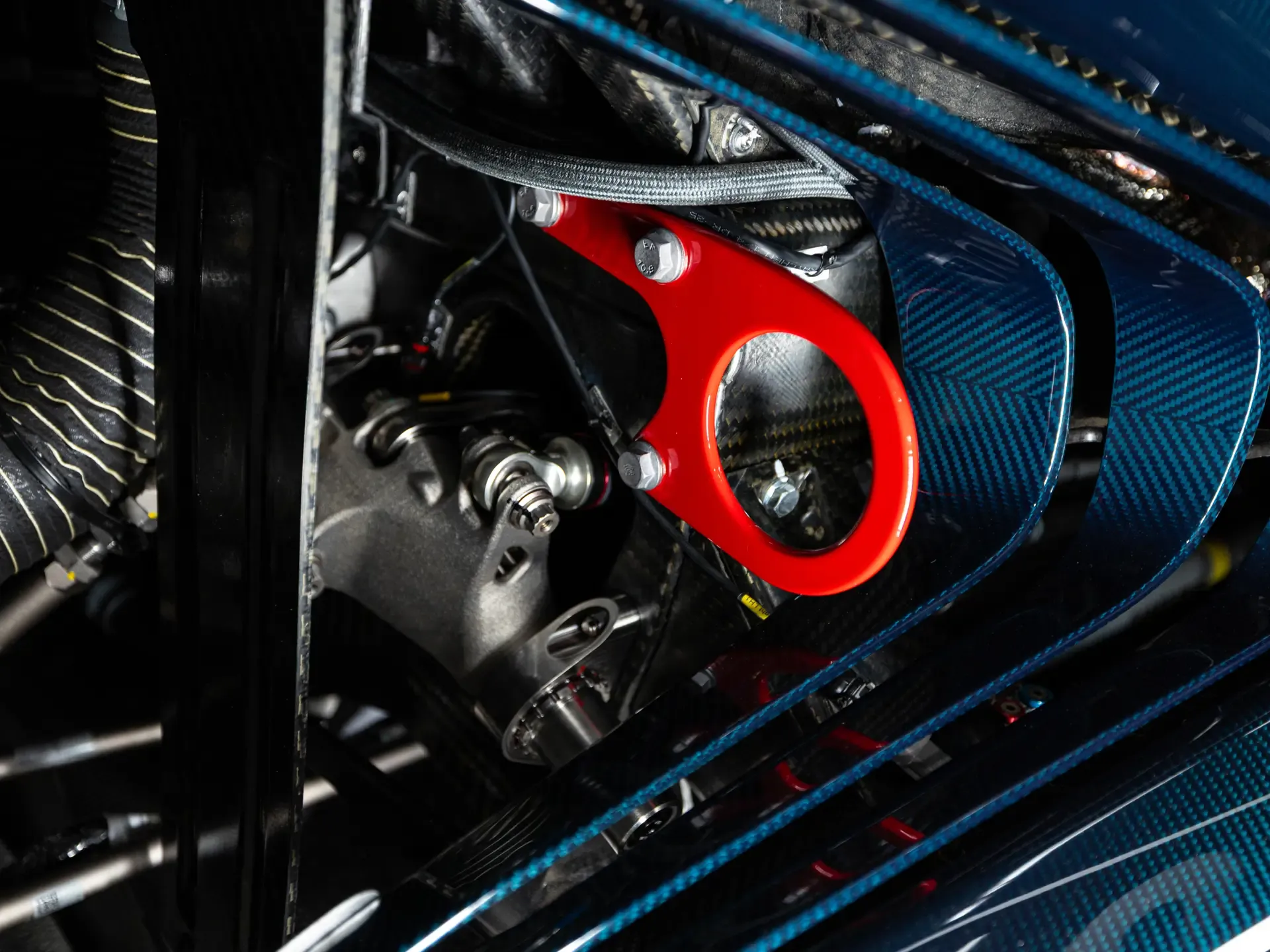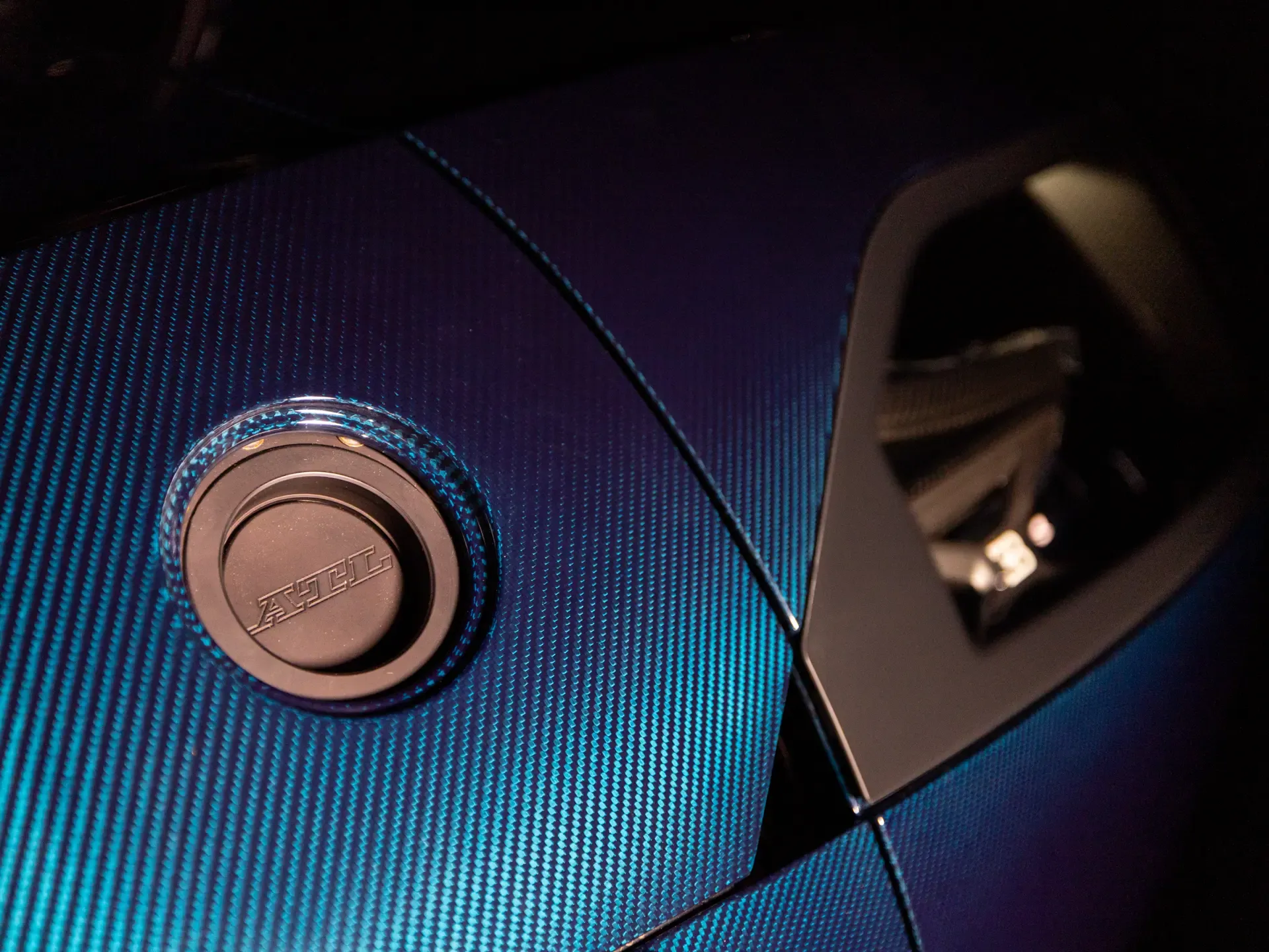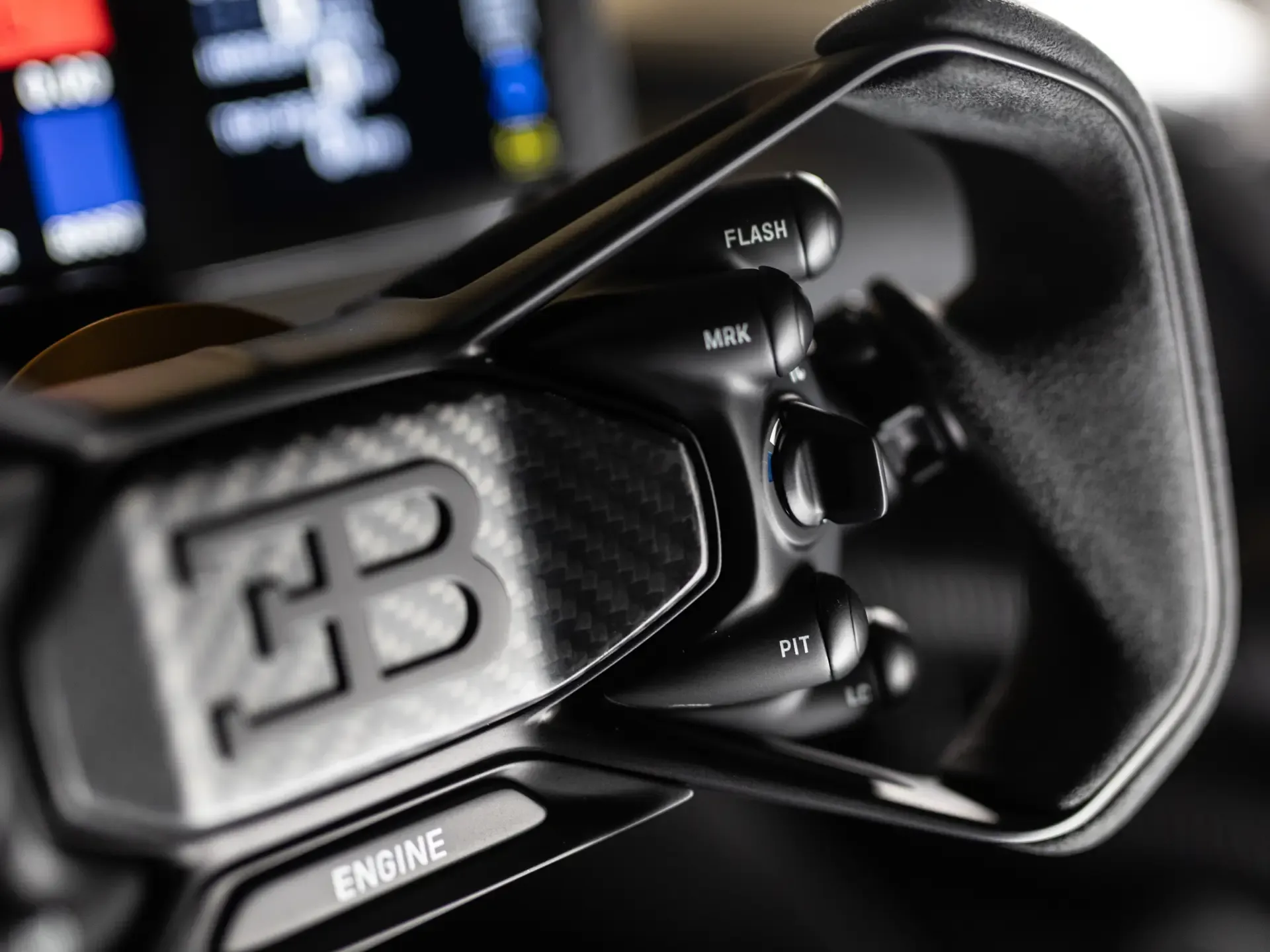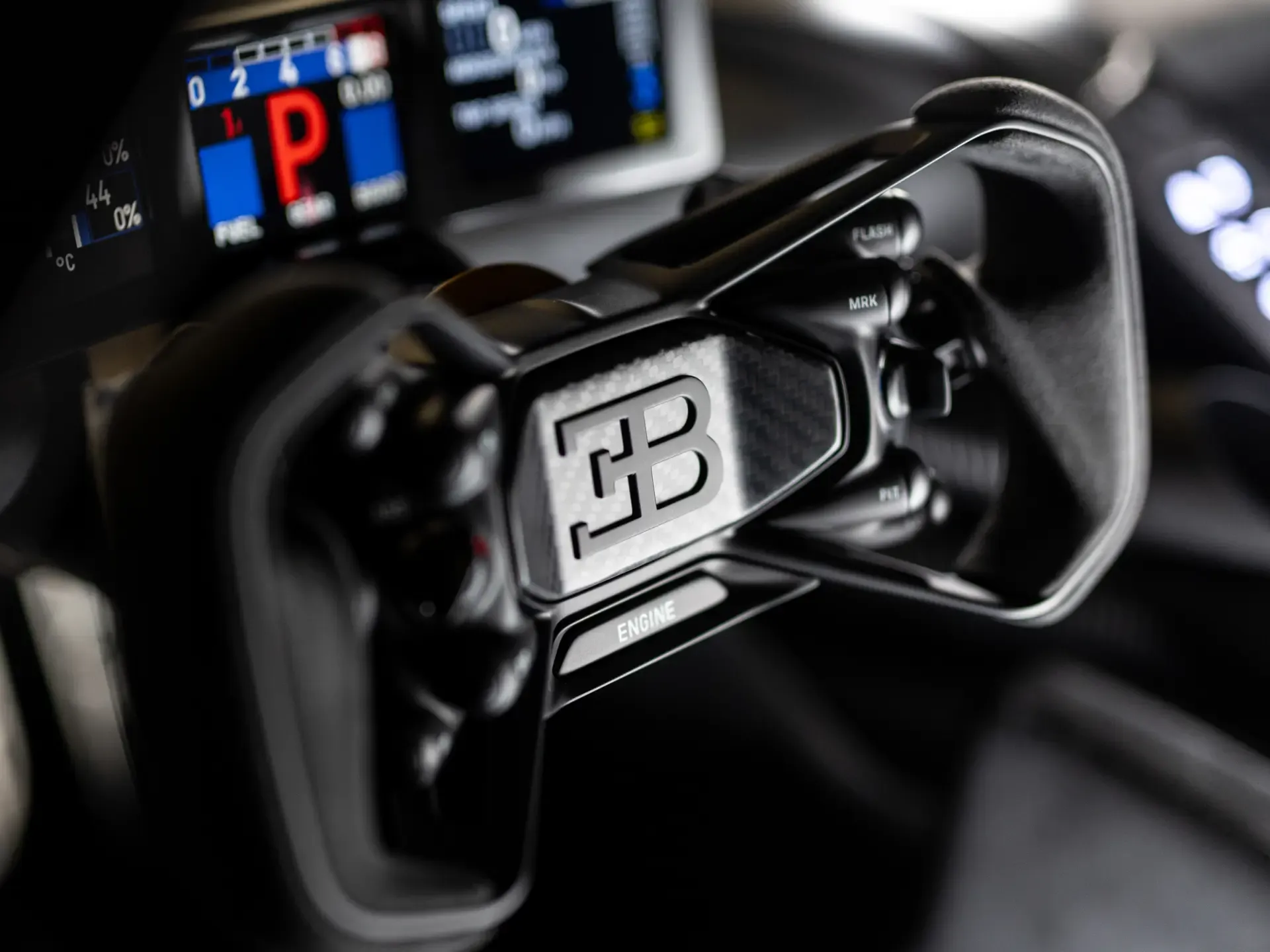 The exterior is Turquoise Carbon with Black Carbon accents—a striking combination on a carbon-fibre monocoque track coupé. Lower aero-linked panels are finished in Black Carbon, while the turning vanes carry subtle French flag motifs. The central intake surround? Blanc. The tow hook? Italian Red. Fuel cap and exhaust deflector stay Black. Wheels are painted Nocturne with Black centre caps, and a stabiliser fin carries the W16.4 badge alongside Bugatti script. Rear wing endplates display the Bugatti logo.